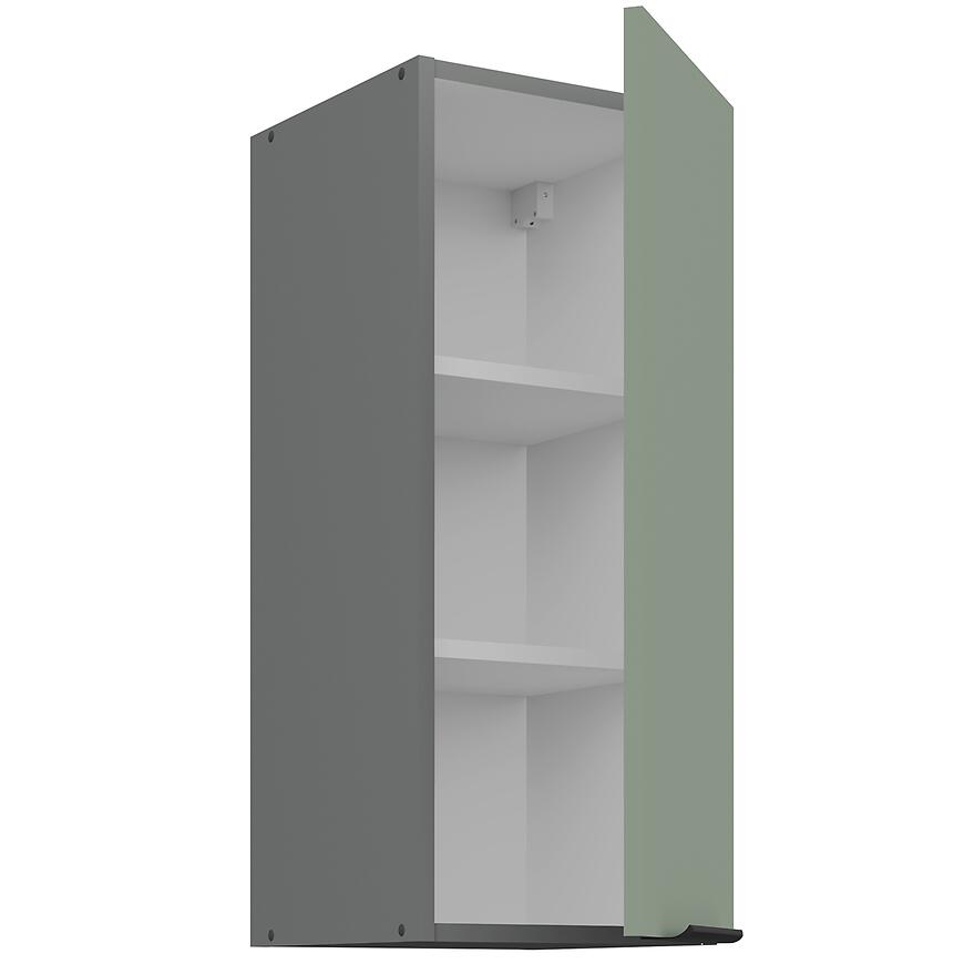 Mebel wykonano z płyty wiórowej laminowanej, co gwarantuje odporność na codzienne użytkowanie i trwałość przez lata. Matowe wykończenie frontów i korpusu podkreśla nowoczesny wygląd, a zielony front w połączeniu z szarym korpusem tworzy estetyczne, modne zestawienie.