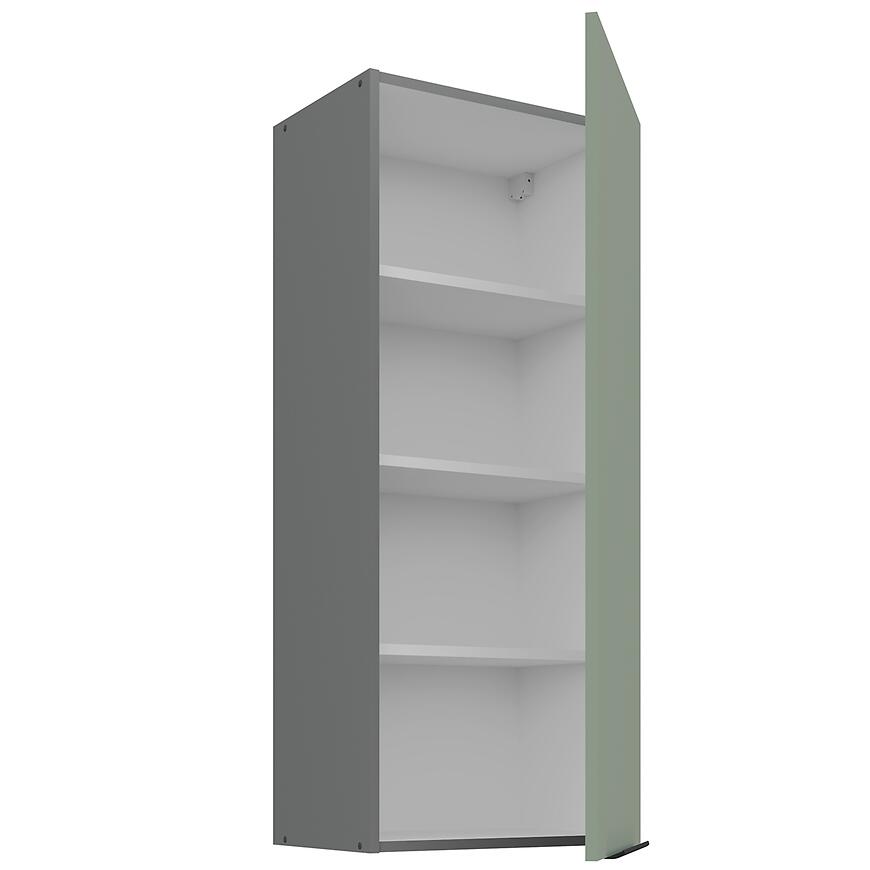 Mebel wykonano z płyty wiórowej laminowanej, co gwarantuje odporność na codzienne użytkowanie i trwałość przez lata. Matowe wykończenie frontów i korpusu podkreśla nowoczesny wygląd, a zielony front w połączeniu z szarym korpusem tworzy estetyczne, modne zestawienie.