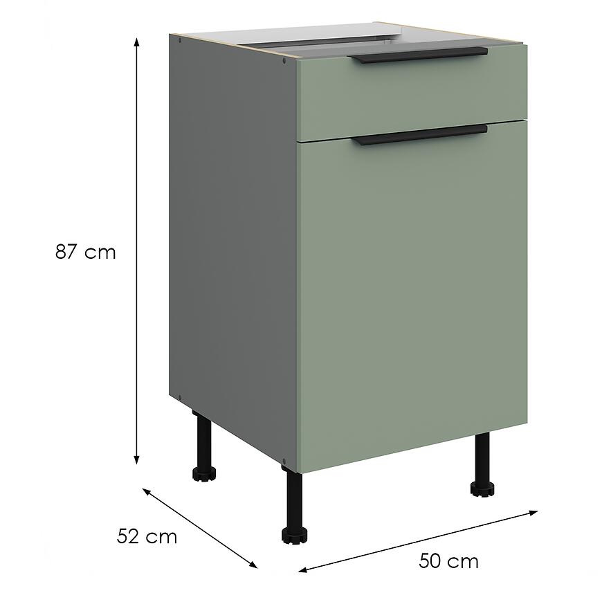 Szafka ma wysokość 87 cm, szerokość 50 cm i głębokość 52 cm. Jedna szuflada i dolny front oferują wygodne przechowywanie naczyń, sztućców oraz innych akcesoriów kuchennych. Dzięki temu utrzymanie porządku w kuchni staje się łatwe i wygodne. Produkt należy do dolnych szafek kuchennych, co pozwala na łatwe dopasowanie do blatów oraz pozostałych elementów zabudowy.