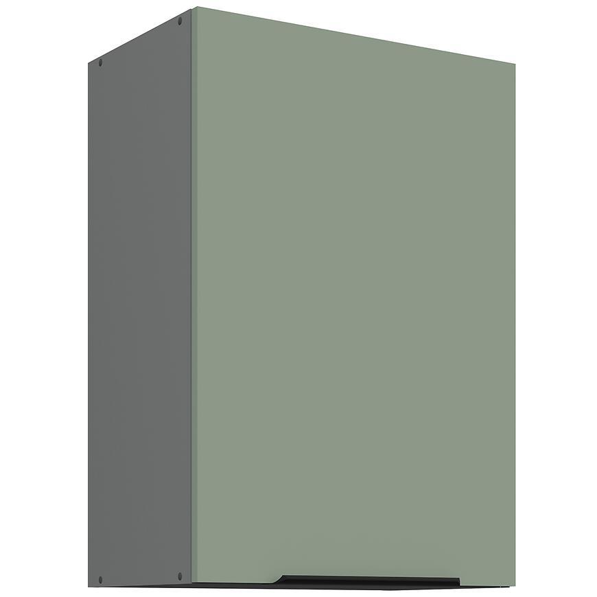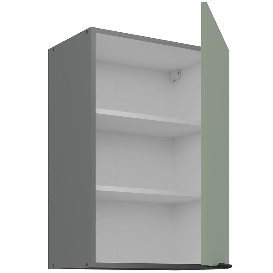 Mebel wykonano z płyty wiórowej laminowanej, co gwarantuje odporność na codzienne użytkowanie i trwałość przez lata. Matowe wykończenie frontów i korpusu podkreśla nowoczesny wygląd, a zielony front w połączeniu z szarym korpusem tworzy estetyczne, modne zestawienie.