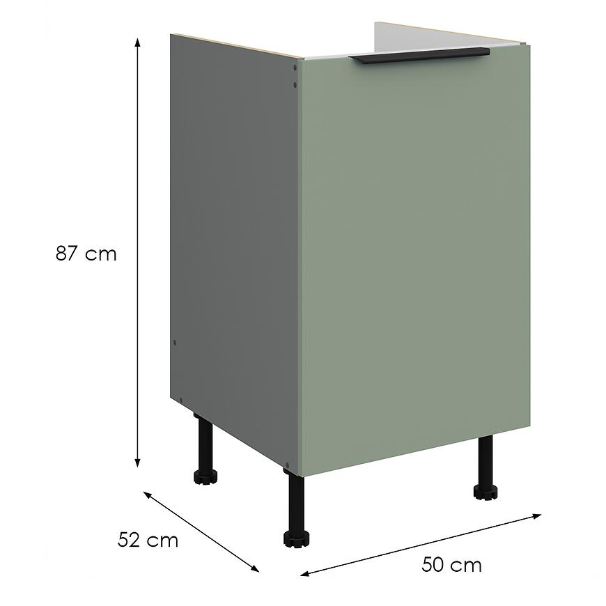 Szafka ma wysokość 87 cm, szerokość 50 cm i głębokość 52 cm. Jedna szuflada zapewnia wygodne przechowywanie naczyń, sztućców oraz innych akcesoriów kuchennych, umożliwiając utrzymanie porządku w kuchni. Produkt należy do dolnych szafek kuchennych, dzięki czemu łatwo go dopasować do blatów i pozostałych elementów zabudowy.