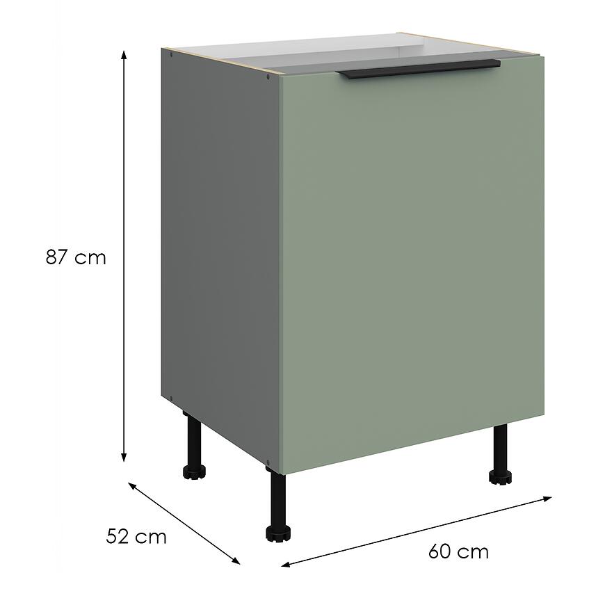 Szafka ma wysokość 87 cm, szerokość 60 cm i głębokość 52 cm. Pojemna szuflada umożliwia wygodne przechowywanie naczyń, garnków oraz akcesoriów kuchennych, co ułatwia utrzymanie porządku w kuchni. Produkt należy do dolnych szafek kuchennych, dzięki czemu łatwo go dopasować do blatów i innych elementów zabudowy.