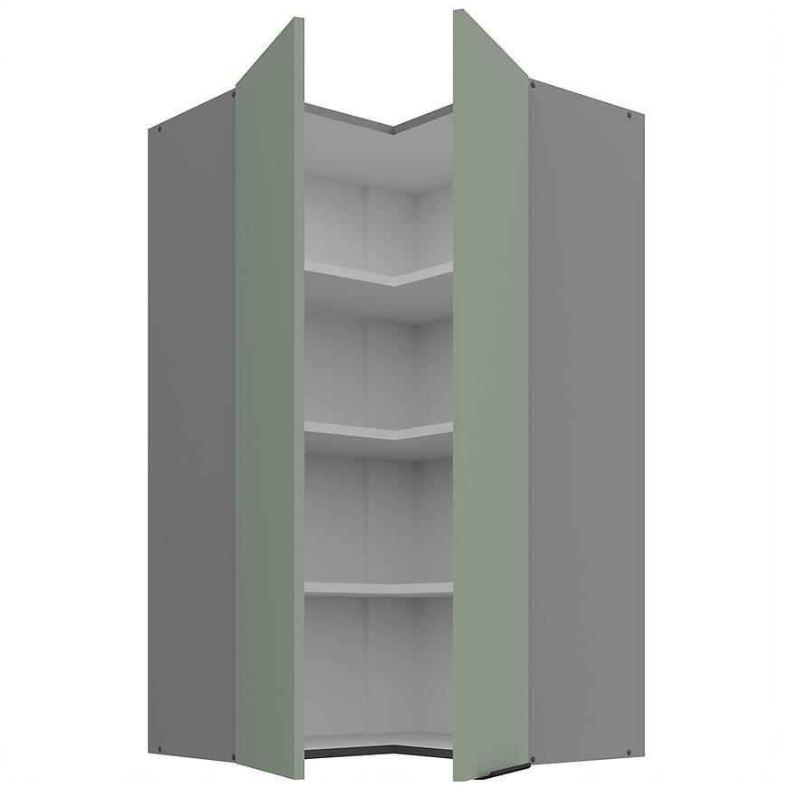 Mebel wykonany z płyty wiórowej laminowanej wyróżnia się wysoką odpornością na uszkodzenia i trwałością przez lata użytkowania. Matowe wykończenie zarówno frontów, jak i korpusu podkreśla jego nowoczesny styl, a zielone fronty w zestawieniu z szarym korpusem dodają wnętrzu subtelnej świeżości i elegancji.