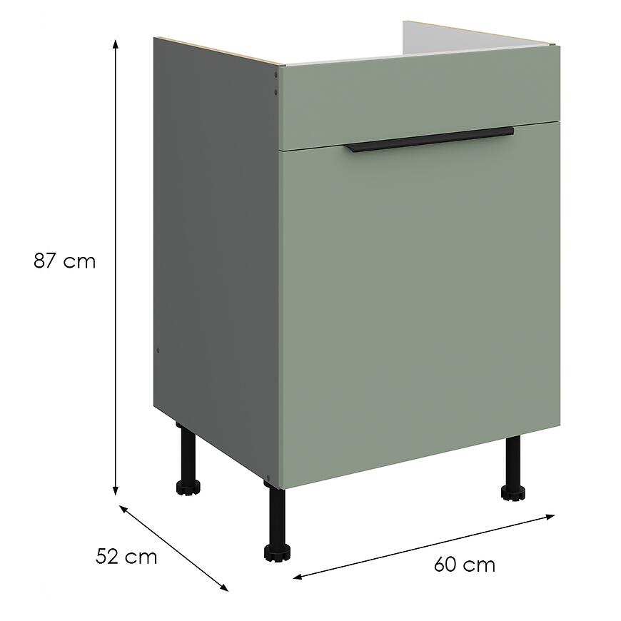 Szafka ma wymiary: wysokość 87 cm, szerokość 60 cm, głębokość 52 cm. Jedna pojemna szuflada pozwala wygodnie przechowywać naczynia, garnki i akcesoria kuchenne, co ułatwia utrzymanie porządku w kuchni. Szafka należy do dolnych szafek kuchennych, dzięki czemu łatwo dopasować ją do blatów i pozostałych elementów zabudowy.