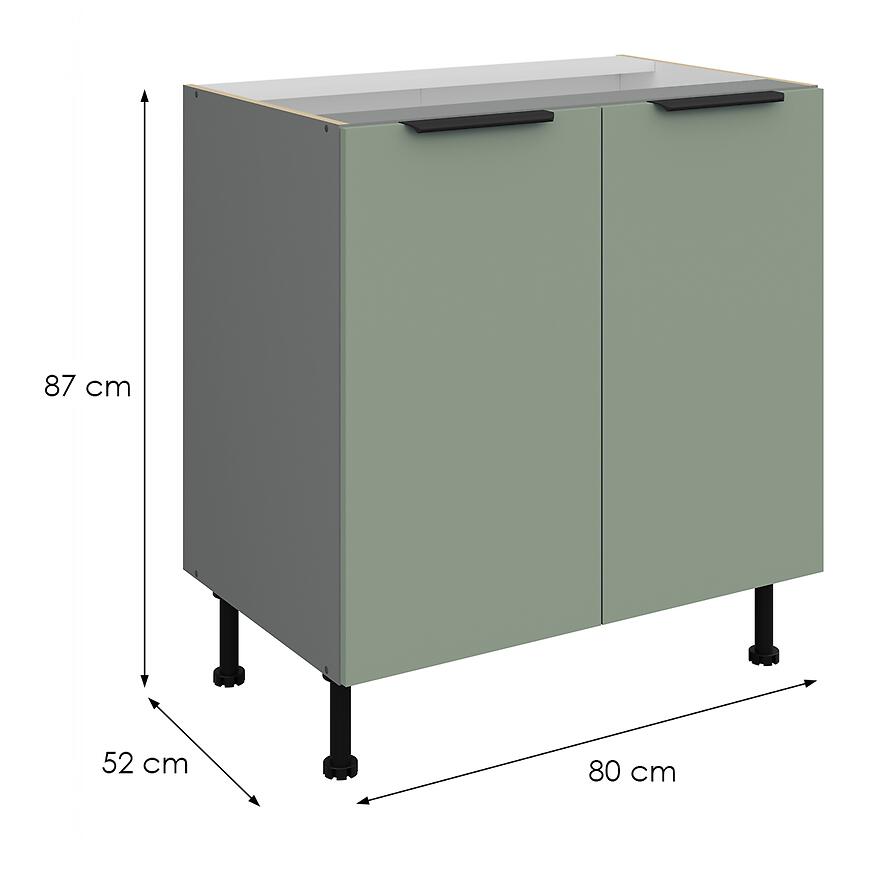 Szafka ma wymiary: wysokość 87 cm, szerokość 80 cm, głębokość 52 cm. Dwie pojemne szuflady umożliwiają wygodne przechowywanie naczyń, garnków i akcesoriów kuchennych, co ułatwia utrzymanie porządku w kuchni. Szafka należy do dolnych szafek kuchennych, co pozwala na łatwe dopasowanie do blatów i pozostałych elementów zabudowy.