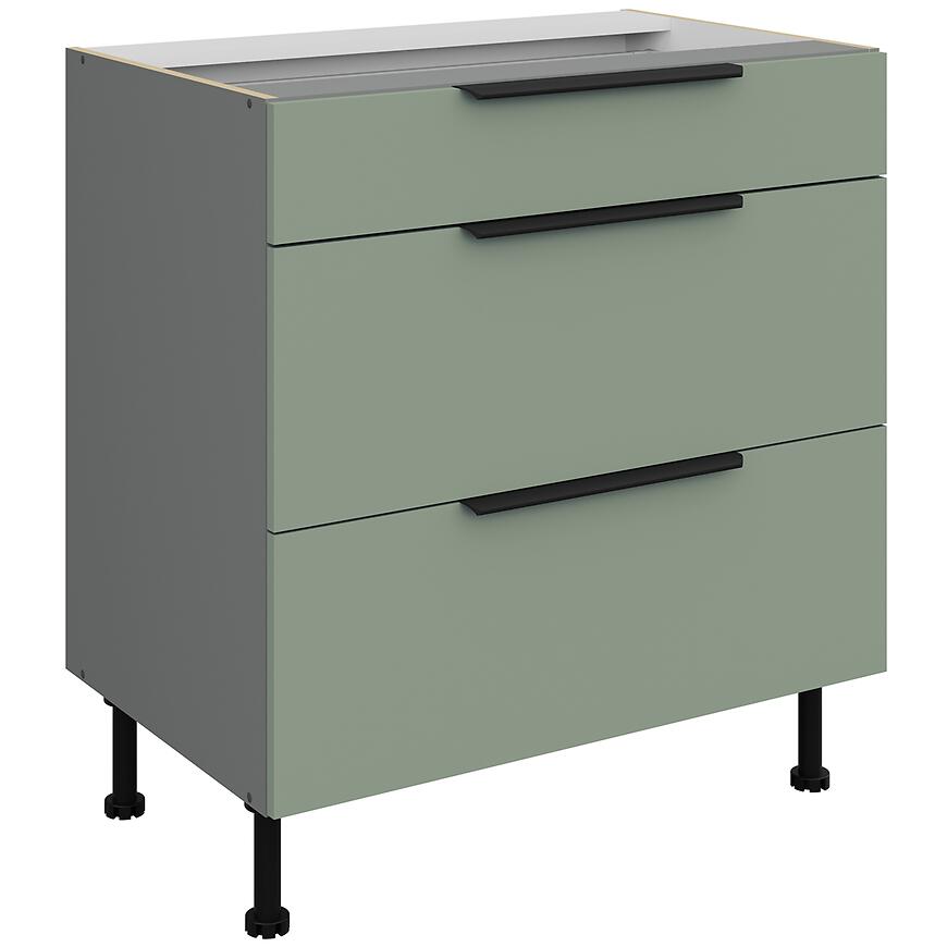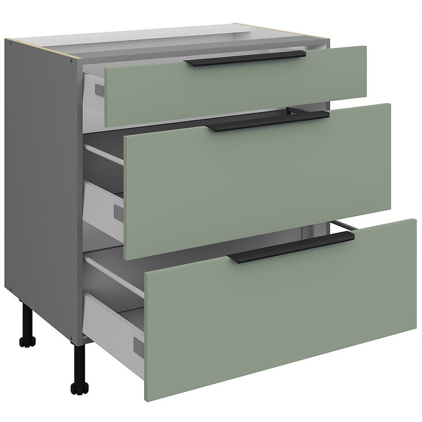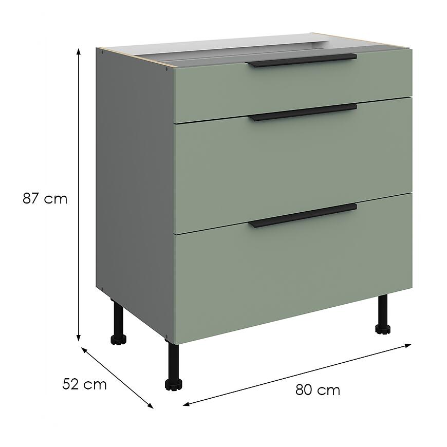 Szafka ma wymiary: wysokość 87 cm, szerokość 80 cm, głębokość 52 cm. Trzy pojemne szuflady umożliwiają wygodne przechowywanie naczyń, garnków i akcesoriów kuchennych, co ułatwia utrzymanie porządku w kuchni. Szafka należy do dolnych szafek kuchennych, co pozwala na łatwe dopasowanie do blatów i pozostałych elementów zabudowy.