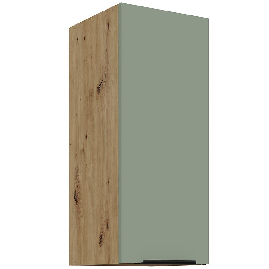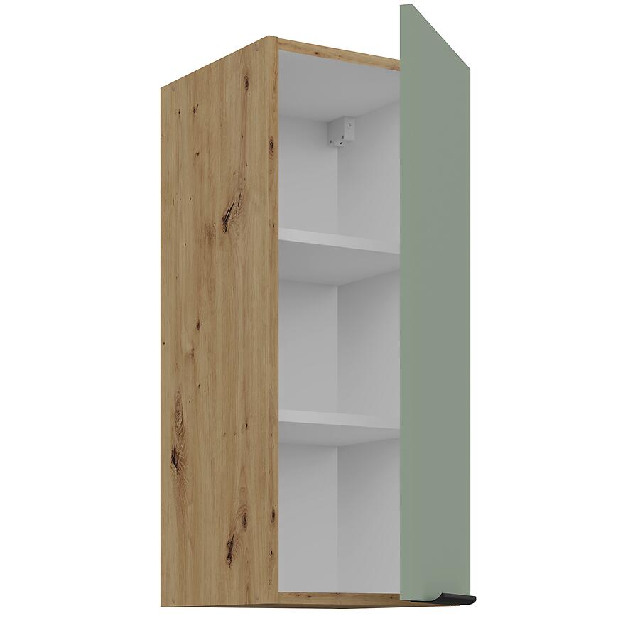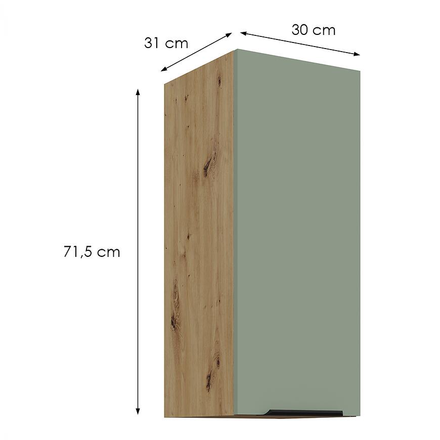 Fronty w kolorze Aquamarine AFM w połączeniu z jasnym korpusem dąb artisan tworzą spójną, nowoczesną aranżację wnętrza. Zielone fronty górne dodają świeżości i wizualnego ożywienia kuchni. Dzięki kompaktowym wymiarom – szerokości 30 cm i wysokości 71,5 cm – szafka zapewnia praktyczne przechowywanie, nie zajmując dużo miejsca w górnej zabudowie kuchennej.