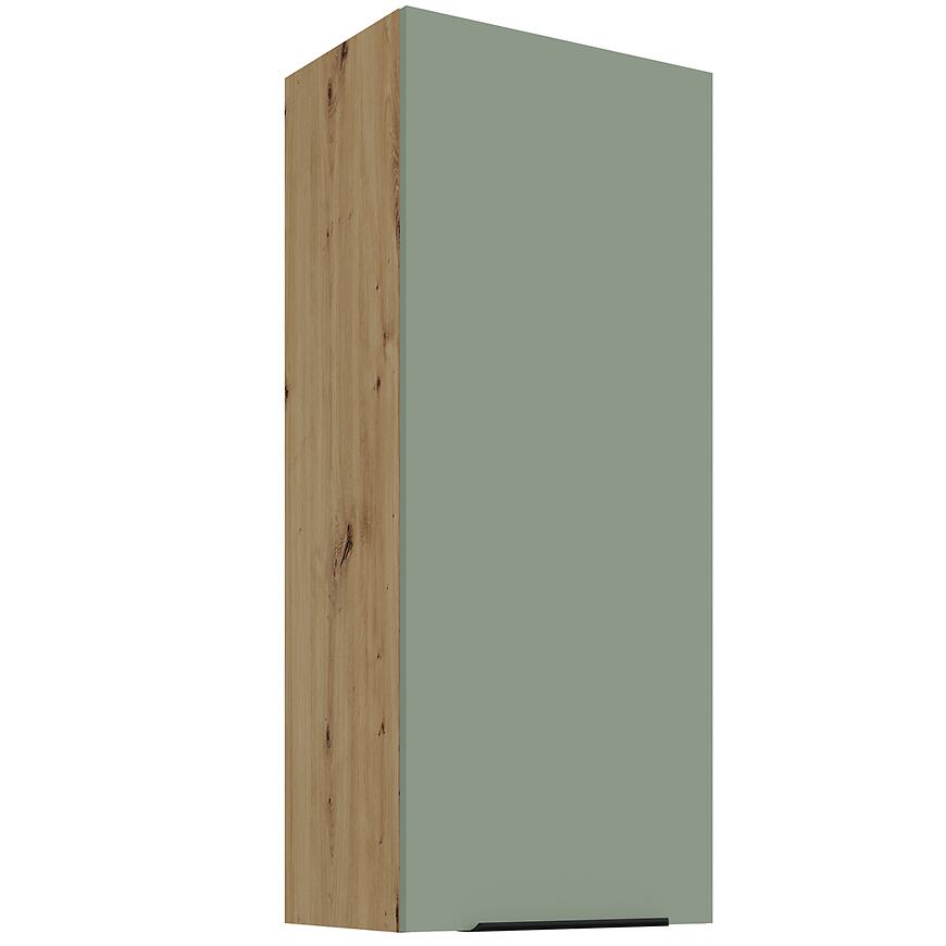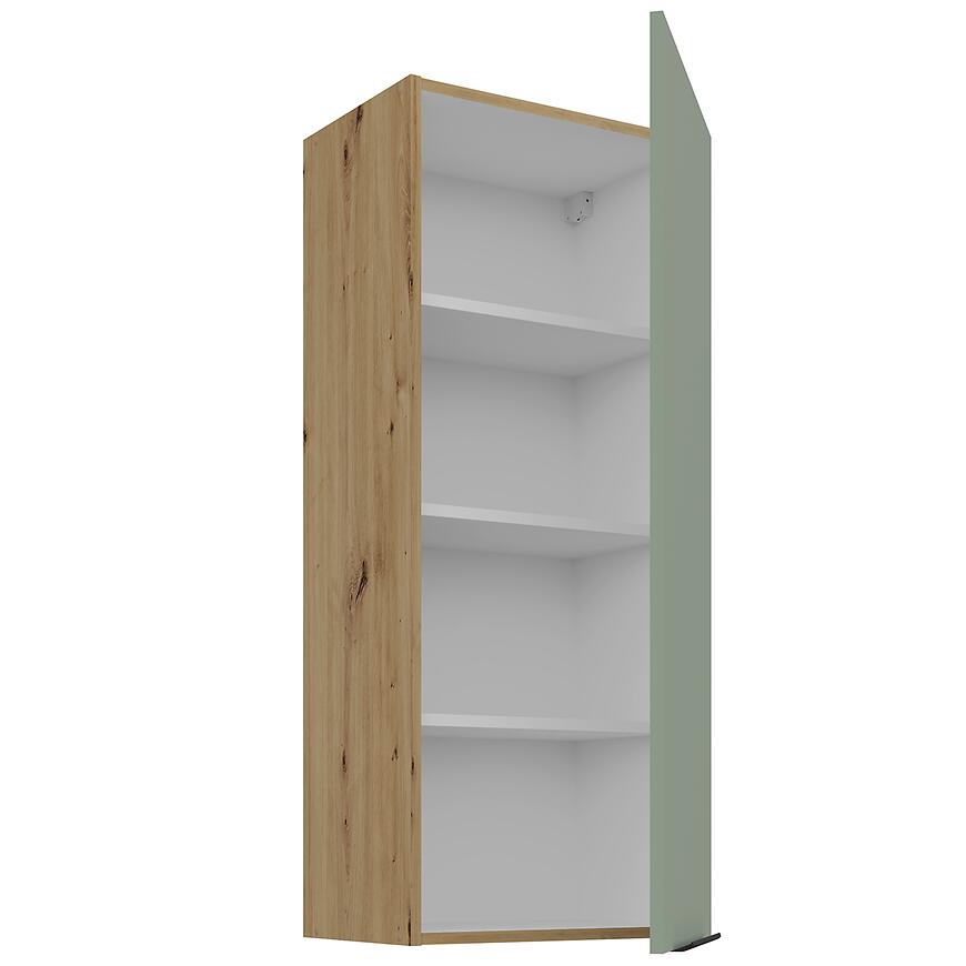 Fronty w kolorze Aquamarine AFM harmonizują z korpusem w wybarwieniu jasny dąb artisan, tworząc nowoczesną, spójną estetykę kuchni. Zielone fronty górne wprowadzają świeży akcent, który odświeża aranżację wnętrza i nadaje kuchni przyjemny, harmonijny wygląd. Wysoka konstrukcja szafki pozwala maksymalnie wykorzystać przestrzeń w górnej części kuchni.