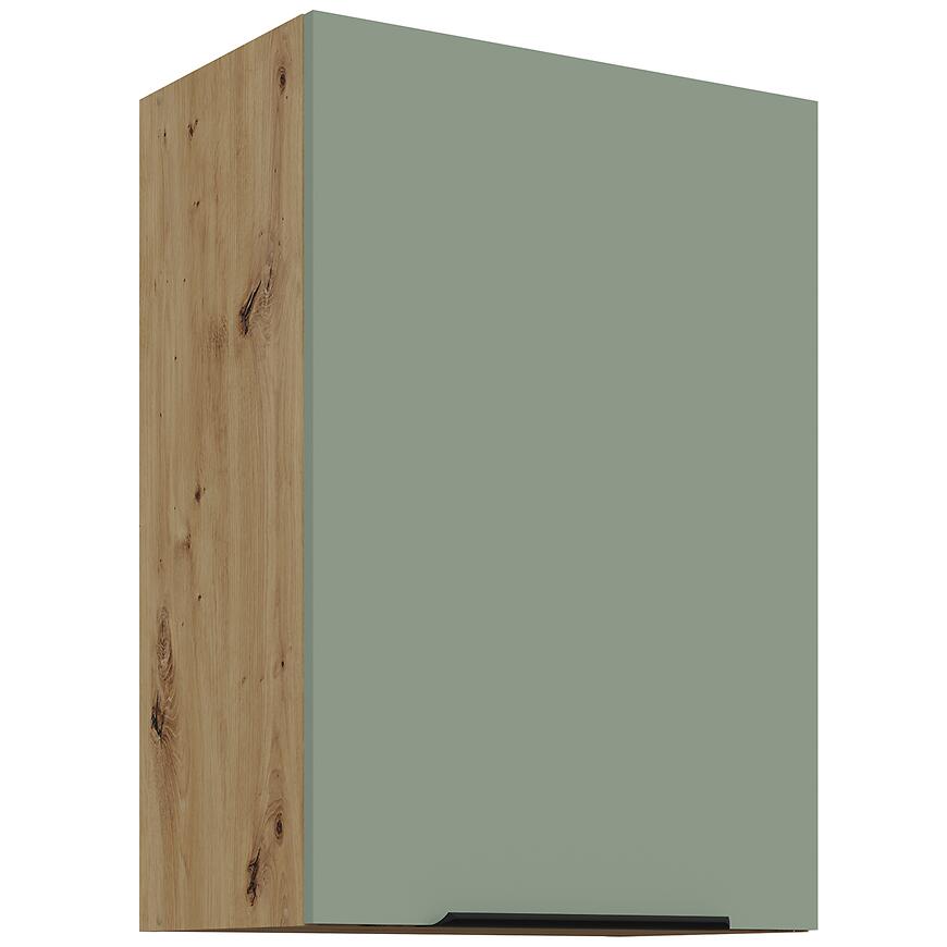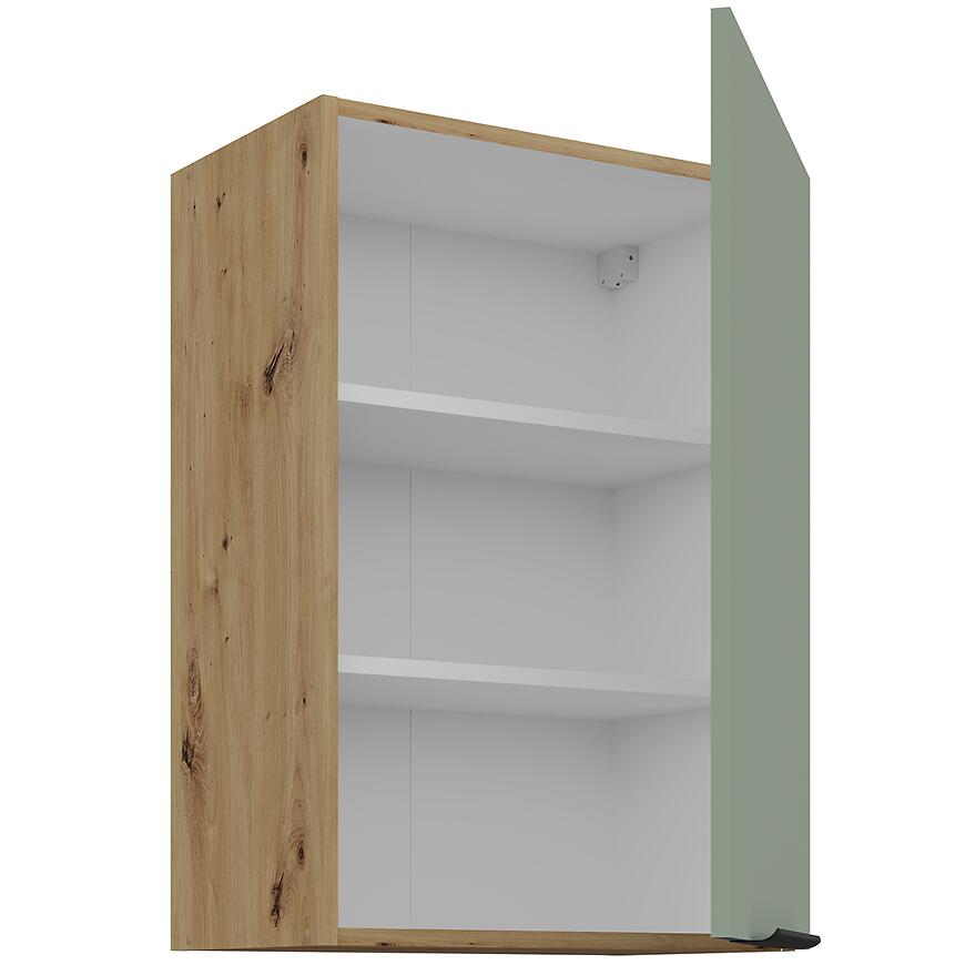 Matowe fronty w kolorze Aquamarine AFM harmonizują z jasnym korpusem w wybarwieniu dąb artisan, tworząc nowoczesną i spójną estetykę kuchni. Zielone fronty górne wprowadzają świeży i elegancki akcent, który odświeża aranżację wnętrza. Szafka jest kompaktowa, ale funkcjonalna, pozwalając wygodnie przechowywać drobne akcesoria kuchenne w przestrzeni górnej.