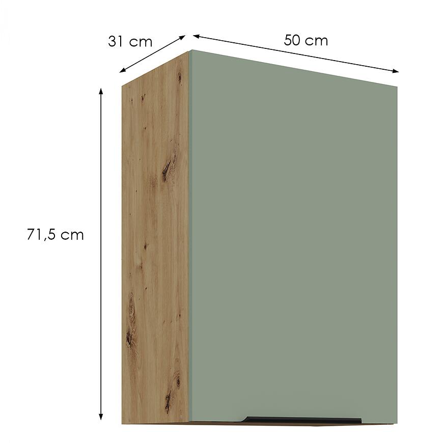 Szafka górna ma wysokość 71,5 cm, szerokość 50 cm i głębokość 31 cm. Jednodrzwiowy front zapewnia łatwy dostęp do wnętrza szafki i ułatwia przechowywanie naczyń oraz akcesoriów kuchennych.