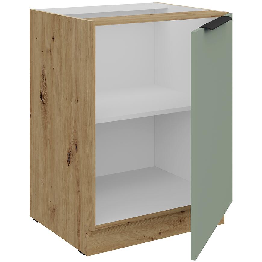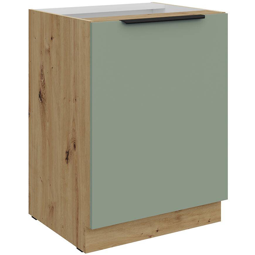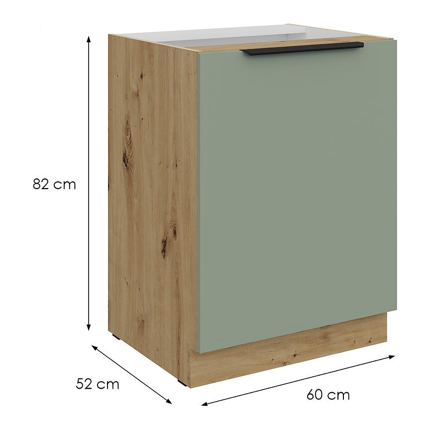 Korpus szafki wykonano z płyty wiórowej laminowanej, wykończonej w jasnym drewnopodobnym odcieniu dąb artisan. Taki wybór materiału gwarantuje trwałość, odporność na wilgoć oraz stabilną konstrukcję mebla. Szafka wyposażona jest w cokół w kolorze korpusu, który ułatwia estetyczne dopasowanie do pozostałych elementów kuchni, zapewniając spójny wygląd całej zabudowy.