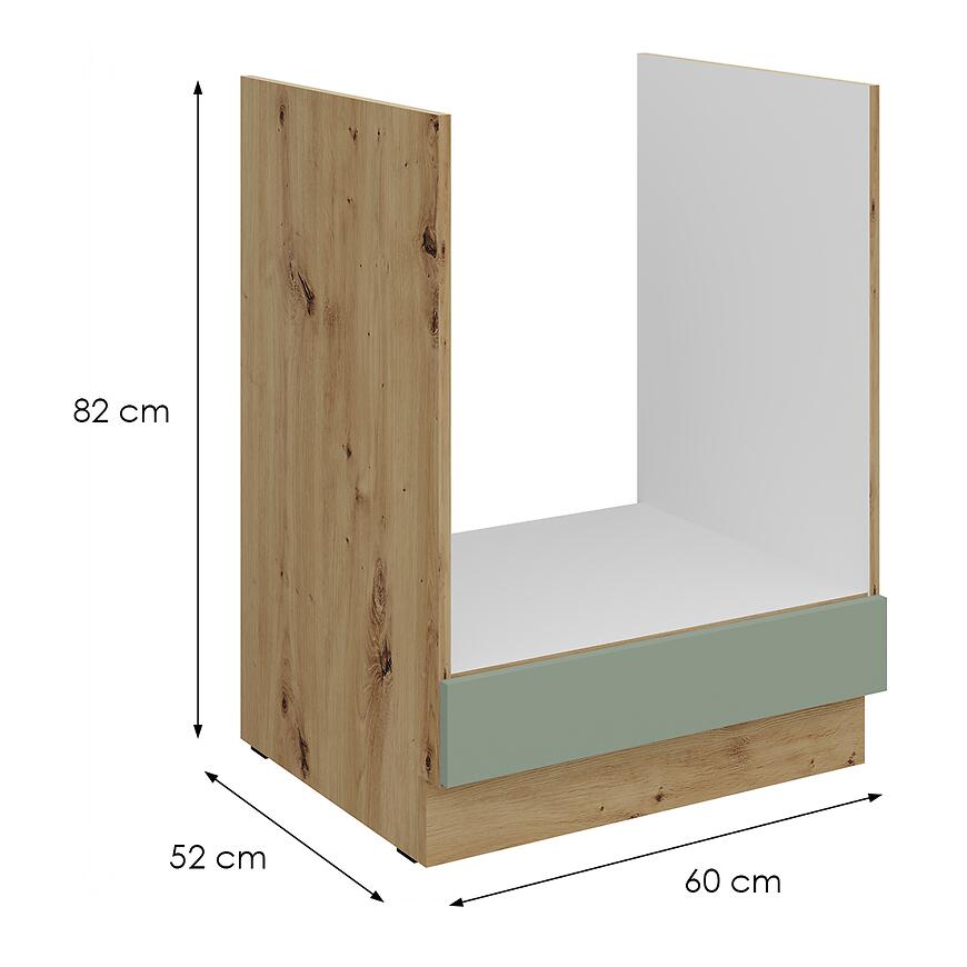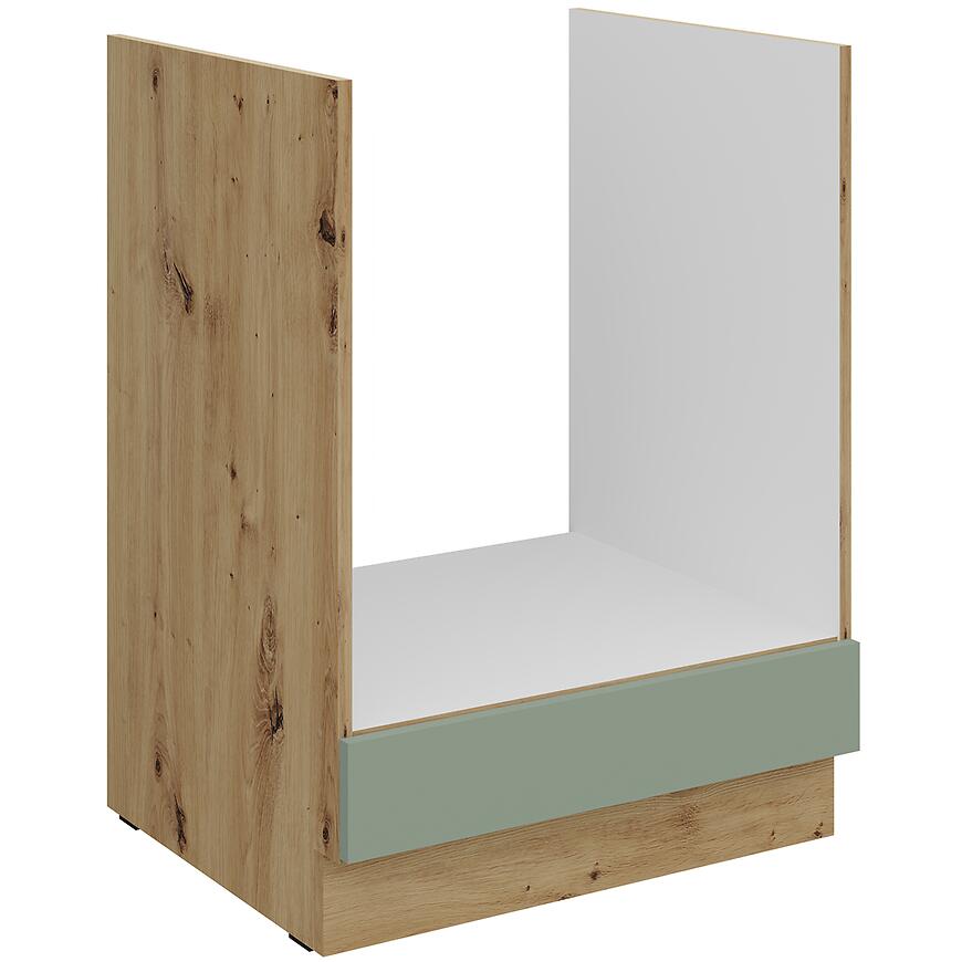 Korpus szafki wykonano z płyty wiórowej laminowanej, wykończonej w jasnym drewnopodobnym odcieniu dąb artisan. Taki wybór materiału gwarantuje trwałość, odporność na wilgoć oraz stabilną konstrukcję mebla. Szafka wyposażona jest w cokół w kolorze korpusu, który ułatwia estetyczne dopasowanie do pozostałych elementów kuchni, zapewniając spójny wygląd całej zabudowy.