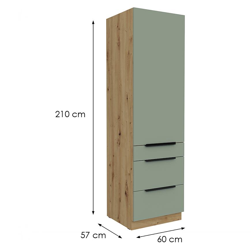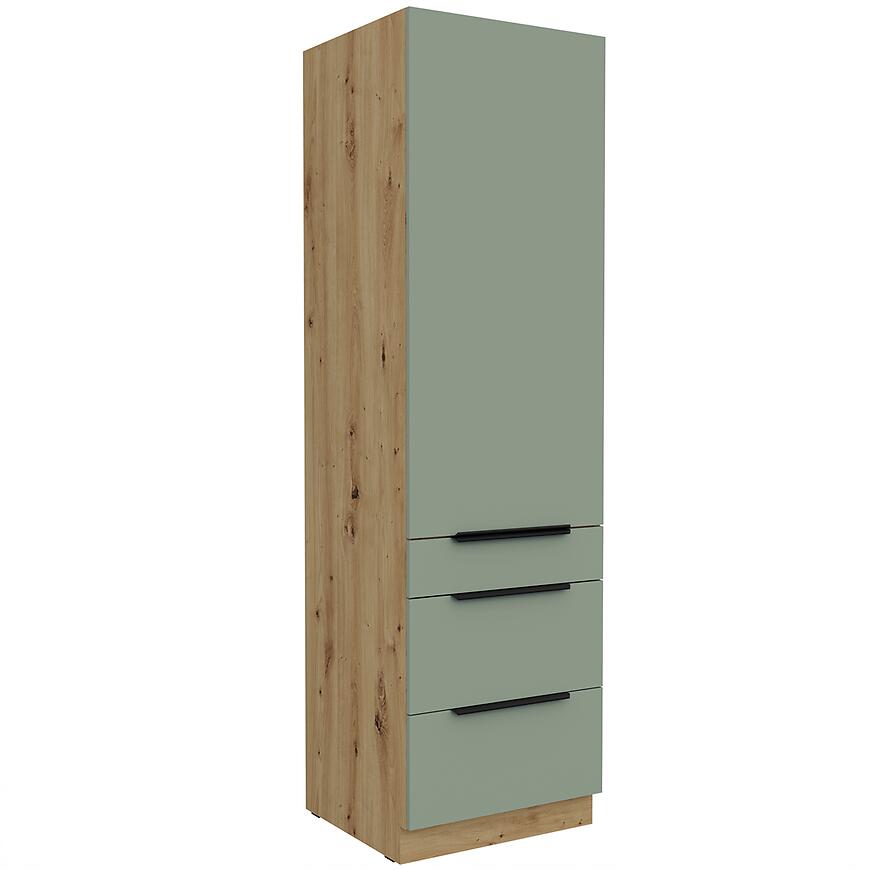 Model Aria-Sa/Ar powstał z płyty wiórowej laminowanej, zarówno w przypadku frontów, jak i korpusu. Materiał ten charakteryzuje się stabilnością i odpornością na codzienne użytkowanie, co sprawia, że szafka przez lata prezentuje się równie dobrze, jak w dniu montażu. Matowe wykończenie korpusu i frontów dodaje kuchni elegancji i harmonii, a odpowiednio dopasowany cokół w kolorze korpusu pozwala zachować spójność całej zabudowy. Dzięki temu szafka doskonale wpisuje się w zabudowę kuchni kolumnowej, stanowiąc jej nieodzowny element.