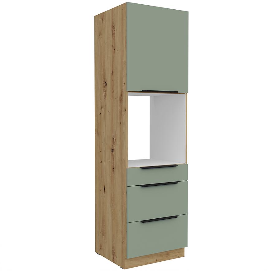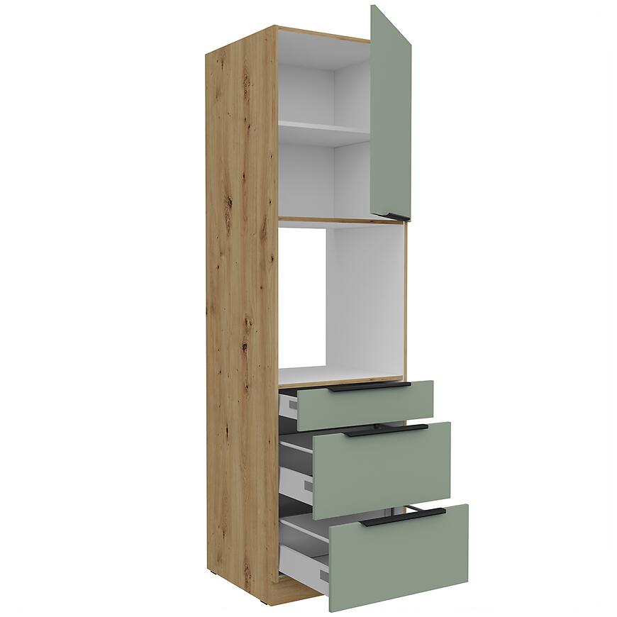 Model Aria-Sa/Ar powstał z płyty wiórowej laminowanej, zarówno w przypadku frontów, jak i korpusu. Materiał ten charakteryzuje się stabilnością i odpornością na codzienne użytkowanie, co sprawia, że szafka przez lata prezentuje się równie dobrze, jak w dniu montażu. Matowe wykończenie korpusu i frontów dodaje kuchni elegancji i harmonii, a odpowiednio dopasowany cokół w kolorze korpusu pozwala zachować spójność całej zabudowy. Dzięki temu szafka doskonale wpisuje się w zabudowę kuchni kolumnowej, stanowiąc jej nieodzowny element.
