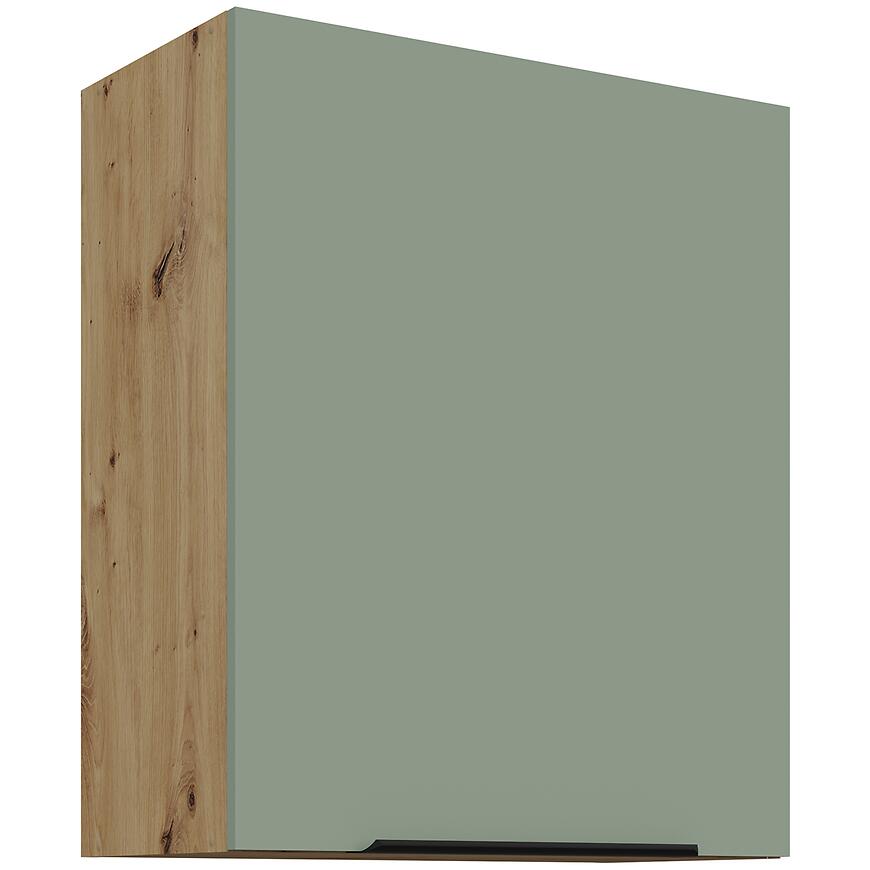 Szafka kuchenna Aria-Sa/Ar Anti Fingerprint 60g-72 1f to elegancka szafka górna, łącząca nowoczesny wygląd z funkcjonalnością. Fronty w kolorze Aquamarine AFM z powłoką Anti Fingerprint zapewniają łatwe utrzymanie czystości, a matowe wykończenie dodaje meblowi subtelnej elegancji. Jasny korpus w odcieniu dąb artisan harmonijnie współgra z zielonymi frontami, tworząc przyjemny kontrast i świeży akcent w kuchni.