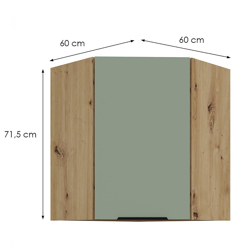 Szafka górna ma wysokość 71,5 cm, szerokość 60 cm i głębokość 60 cm, a front jest ustawiony pod kątem 45°, co umożliwia efektywne wykorzystanie narożnych przestrzeni kuchennych. Jednodrzwiowy front zapewnia wygodny dostęp do przechowywanych przedmiotów i łatwe utrzymanie porządku.