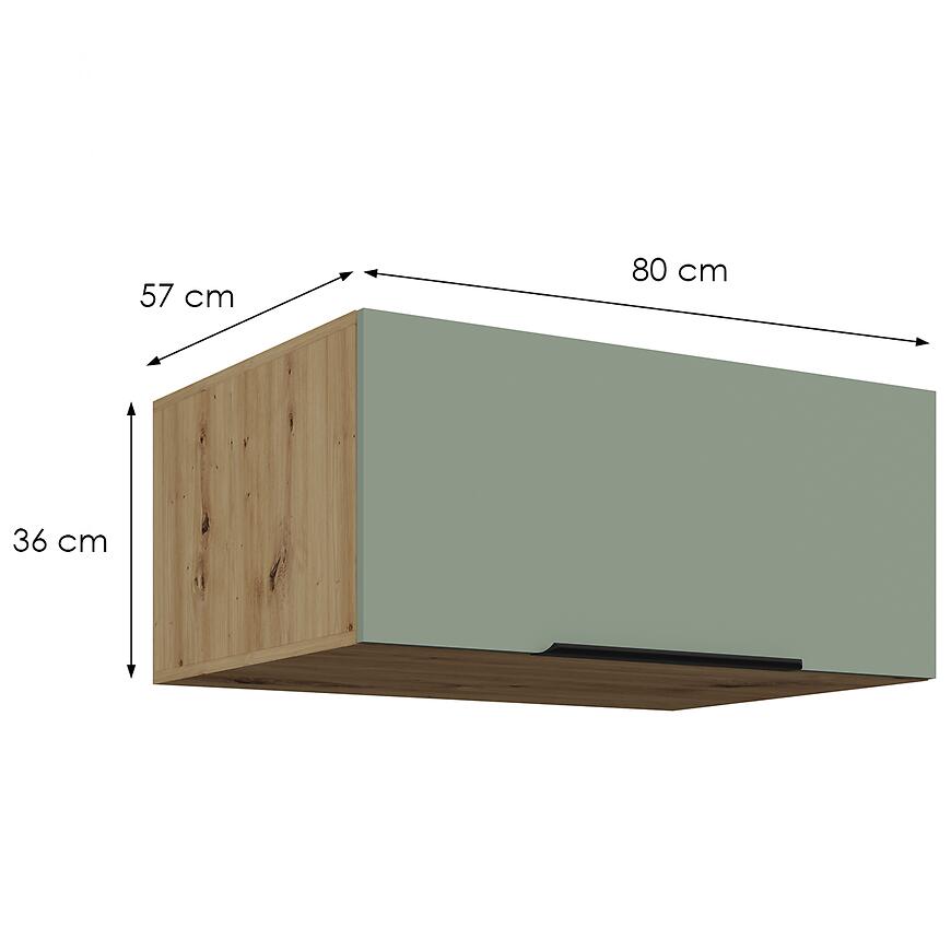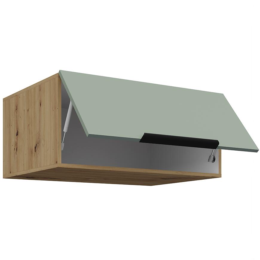 Szafka kuchenna Aria-Sa/Ar Anti Fingerprint 80 Nagu-36 1f to narożna szafka górna o nowoczesnym designie, zaprojektowana z myślą o funkcjonalnej aranżacji kuchni. Fronty w kolorze Aquamarine AFM z powłoką Anti Fingerprint ułatwiają utrzymanie czystości i estetyki przez długi czas, a matowe wykończenie frontów nadaje szafce elegancki charakter. Jasny korpus w odcieniu dąb artisan harmonijnie współgra z zielonymi frontami, tworząc świeży akcent we wnętrzu kuchni.