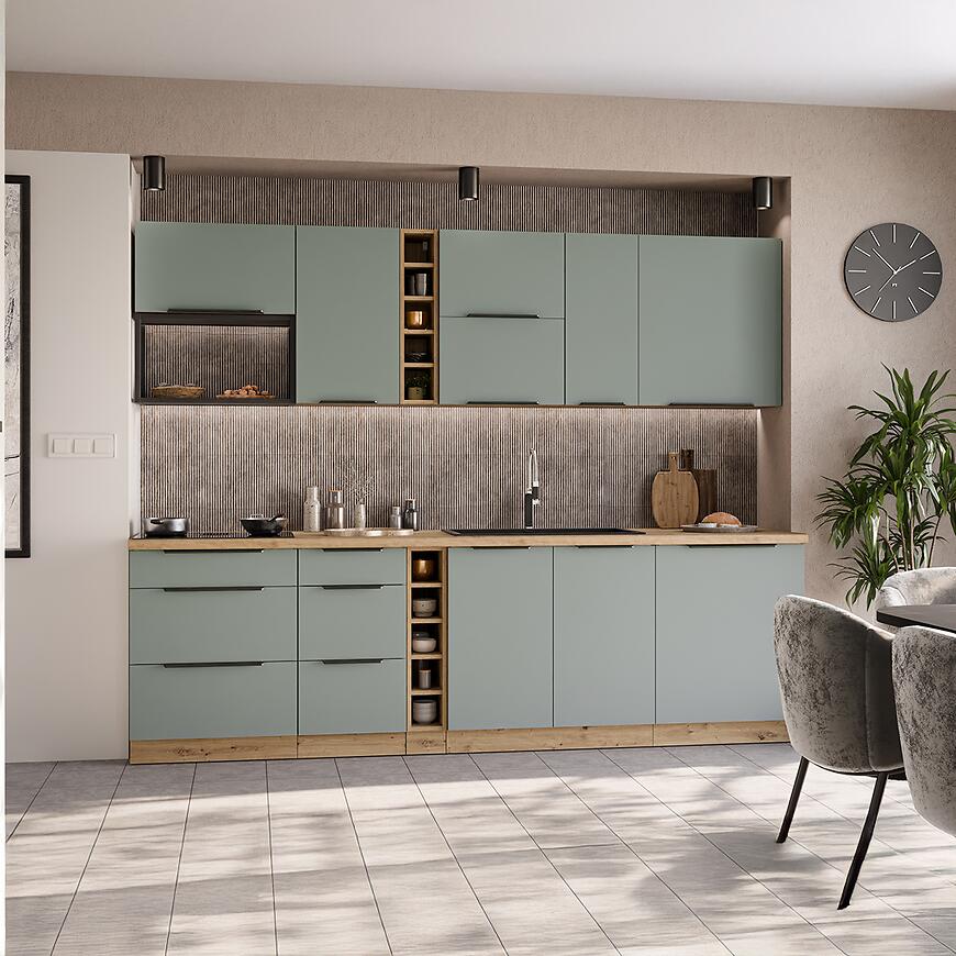 Fronty w kolorze Aquamarine AFM z matowym wykończeniem współgrają z korpusem w wybarwieniu jasny dąb artisan, tworząc nowoczesną i spójną estetykę kuchni. Zielone fronty górne nadają wnętrzu świeży, elegancki wygląd, a narożna konstrukcja szafki pozwala w pełni wykorzystać trudnodostępne przestrzenie w kuchni.