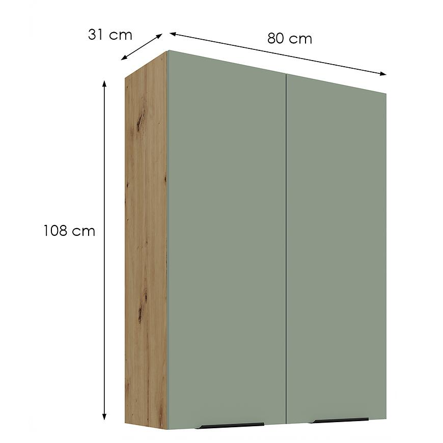 Szafka górna ma wysokość 108 cm, szerokość 80 cm i głębokość 31 cm, co pozwala maksymalnie wykorzystać przestrzeń w kuchni i zapewnia wygodny dostęp do wszystkich przechowywanych przedmiotów. Dwie drzwiczki umożliwiają łatwe segregowanie zawartości, zachowując porządek i estetykę kuchni.