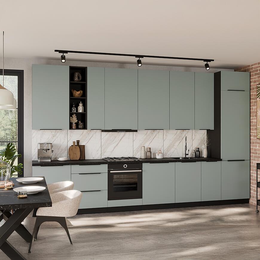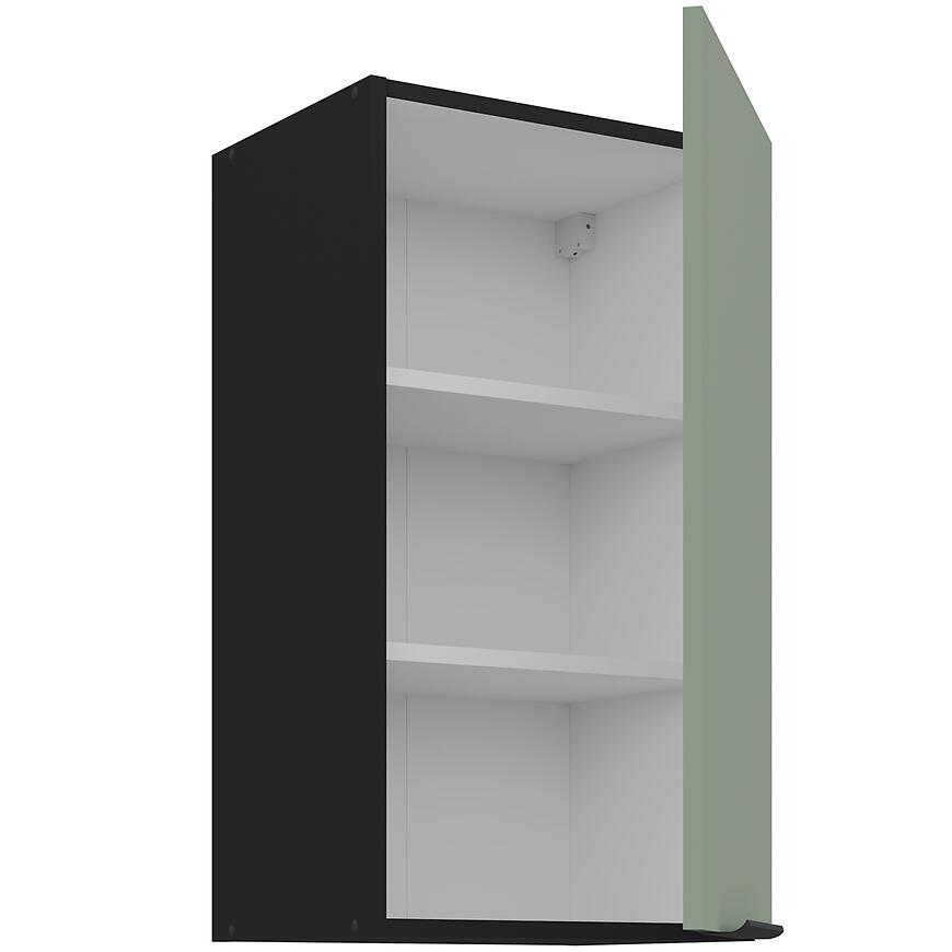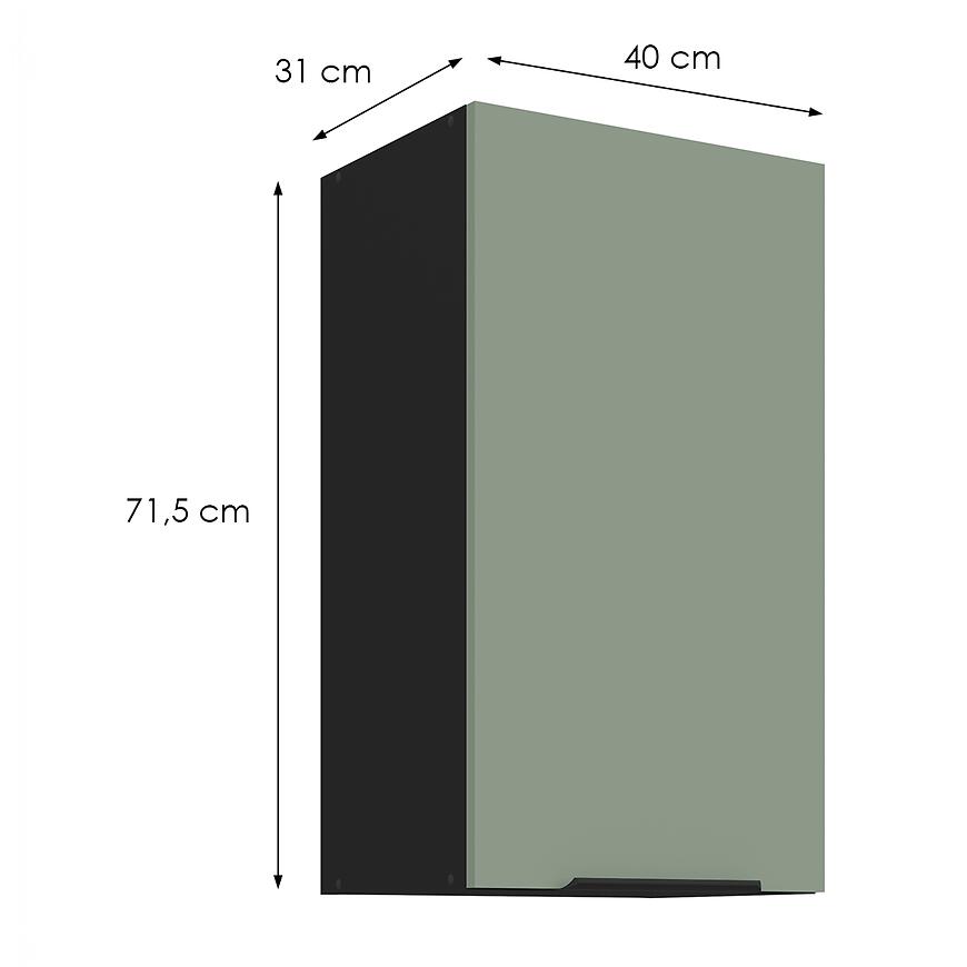 Mebel wykonano z płyty wiórowej laminowanej, co gwarantuje odporność na codzienne użytkowanie i długowieczność mebla. Matowe wykończenie frontów i korpusu podkreśla nowoczesny wygląd, a zielony front w połączeniu z czarnym korpusem tworzy estetyczne i modne zestawienie.