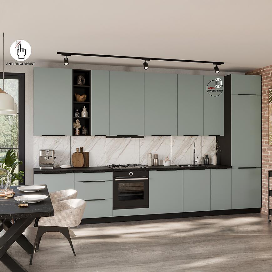 Kolekcja Aria Aquamarine łączy nowoczesny styl z funkcjonalnością. Matowe wykończenie frontów i korpusu minimalizuje widoczność zabrudzeń, a połączenie aquamarine i czarny pasuje zarówno do jasnych, jak i ciemniejszych aranżacji kuchennych. Szafka nie posiada blatu ani nóg, co pozwala na elastyczne dopasowanie do indywidualnych potrzeb projektowych.