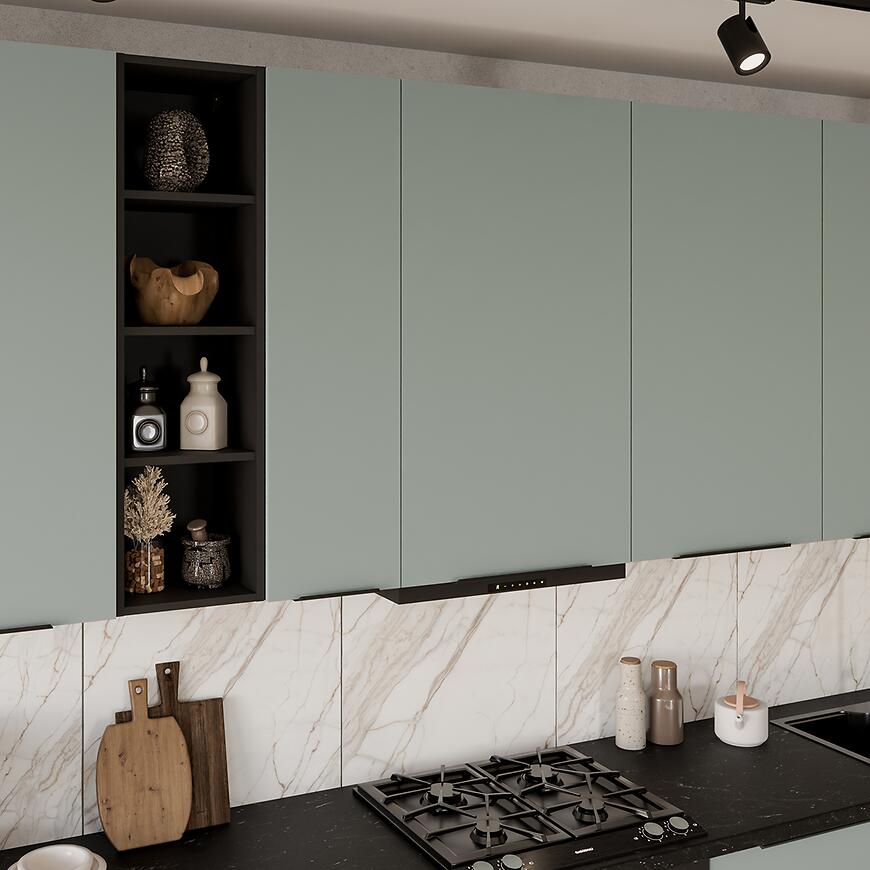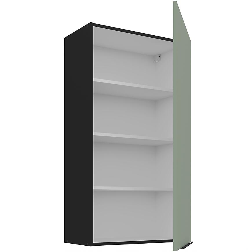 Mebel wykonano z płyty wiórowej laminowanej, co gwarantuje odporność na codzienne użytkowanie i długowieczność mebla. Matowe wykończenie frontów i korpusu podkreśla nowoczesny wygląd, a zielony front w połączeniu z czarnym korpusem tworzy estetyczne i modne zestawienie.