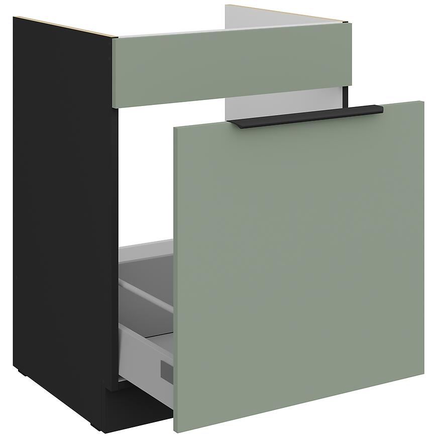 Dolny front szafki jest zielony, a front górny aquamarine, co w połączeniu z czarnym korpusem nadaje kuchni nowoczesny i wyrazisty wygląd. Mechanizm cichego domyku sprawia, że drzwi zamykają się płynnie i bezgłośnie, zwiększając komfort użytkowania i chroniąc fronty przed uszkodzeniami. Szafka wymaga samodzielnego złożenia, a solidna konstrukcja gwarantuje stabilność i wygodę montażu.