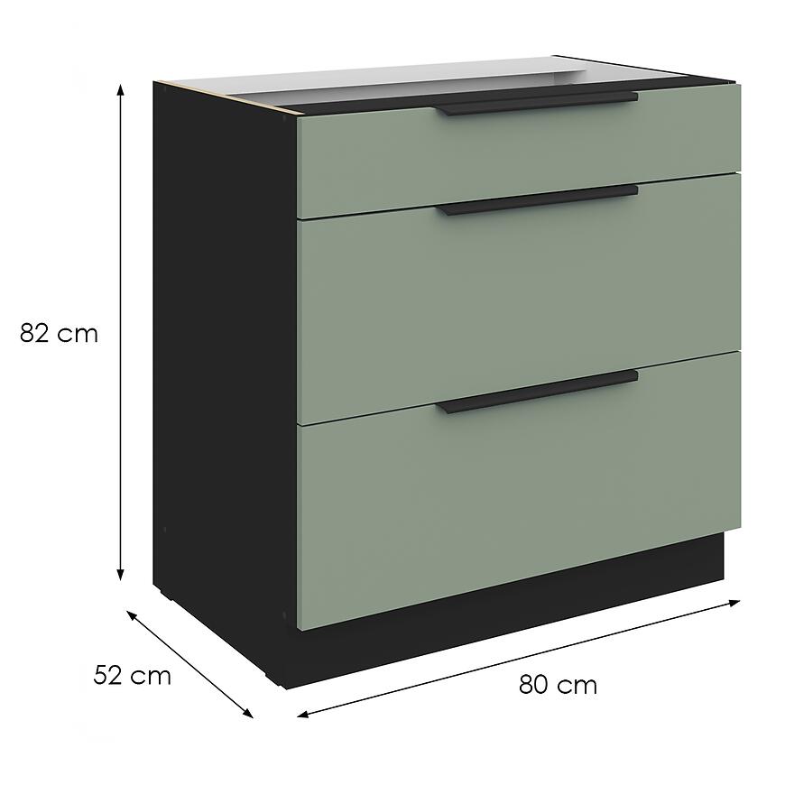 Szafka ma wymiary: wysokość 82 cm, szerokość 80 cm, głębokość 52 cm. Jej pojemność i trzy szuflady umożliwiają wygodne przechowywanie naczyń, garnków i akcesoriów kuchennych. Szafka należy do dolnych szafek kuchennych, co pozwala na łatwe dopasowanie do blatów i pozostałych elementów zabudowy kuchennej.