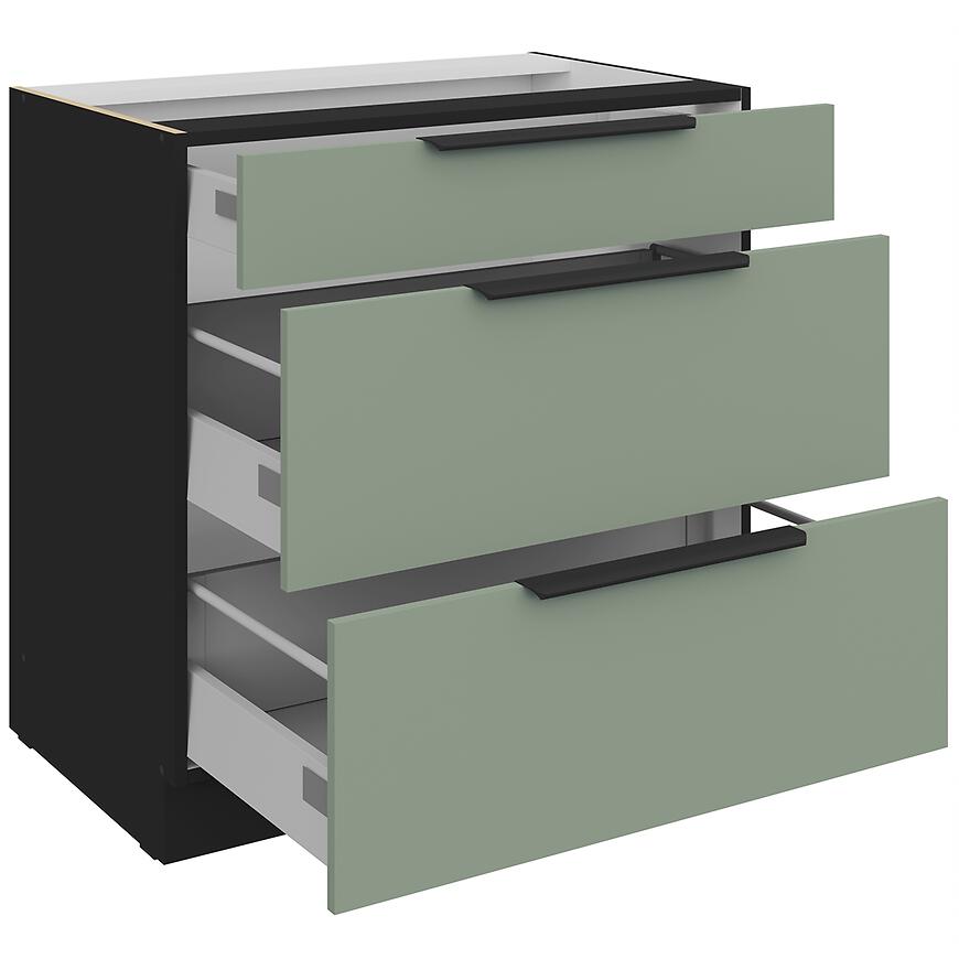 Szafka kuchenna Aria-Sa/Bl Anti Fingerprint 80d 3s Bb to praktyczne rozwiązanie dla osób ceniących styl, trwałość i wygodę w kuchni. Trzy szuflady, matowe fronty i cichy domyk łączą estetykę z funkcjonalnością, a połączenie aquamarine i czarnego koloru nadaje kuchni nowoczesny charakter. Szafka sprawdzi się zarówno w średnich, jak i większych kuchniach, wprowadzając świeży wygląd i porządek.