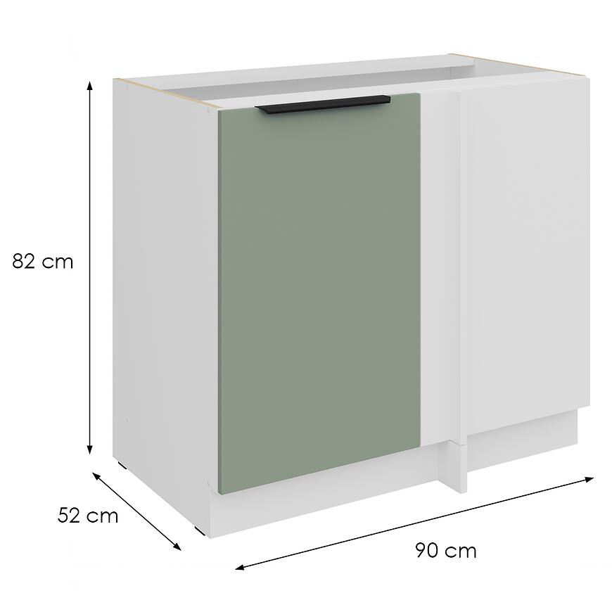 Szafka ma wymiary: wysokość 82 cm, szerokość 90 cm, głębokość 52 cm. Dzięki szerokości 90 cm zapewnia dużą przestrzeń do przechowywania naczyń, garnków i akcesoriów kuchennych. Szafka należy do dolnych szafek kuchennych, co umożliwia łatwe dopasowanie do blatów i pozostałych elementów zabudowy kuchennej.