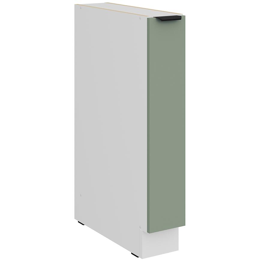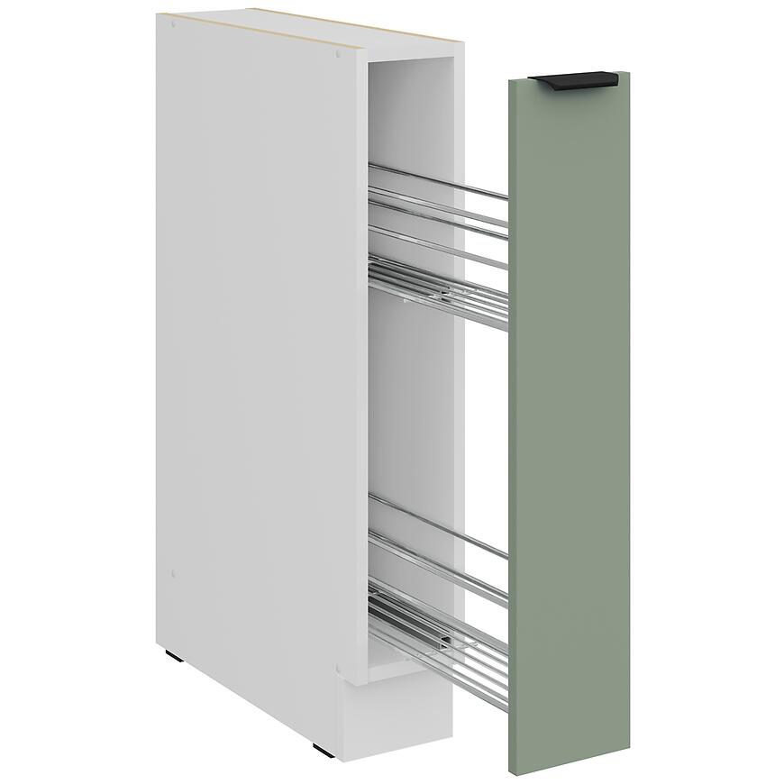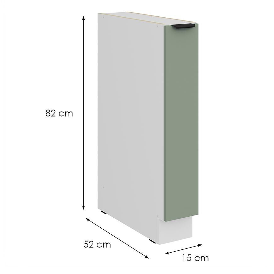 Szafka ma wymiary: wysokość 82 cm, szerokość 15 cm, głębokość 52 cm. Dzięki niewielkiej szerokości idealnie nadaje się do wąskich przestrzeni w kuchni, oferując praktyczną przestrzeń do przechowywania przypraw, butelek czy akcesoriów kuchennych. Szafka należy do dolnych szafek kuchennych, co umożliwia łatwe dopasowanie do blatów i pozostałych elementów zabudowy.