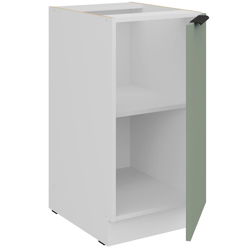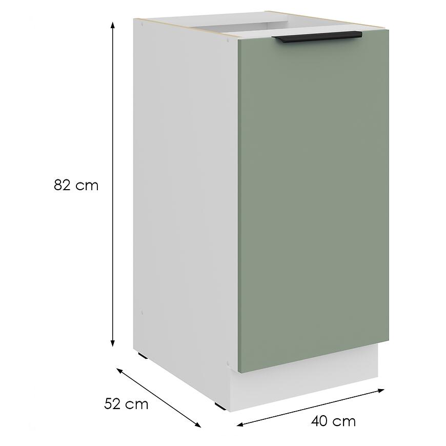 Szafka ma wymiary: wysokość 82 cm, szerokość 40 cm, głębokość 52 cm. Dzięki kompaktowym wymiarom sprawdzi się w mniejszych i standardowych kuchniach, oferując przestrzeń do przechowywania naczyń, garnków i akcesoriów kuchennych. Szafka należy do dolnych szafek kuchennych, co umożliwia łatwe dopasowanie do blatów i pozostałych elementów zabudowy kuchennej.