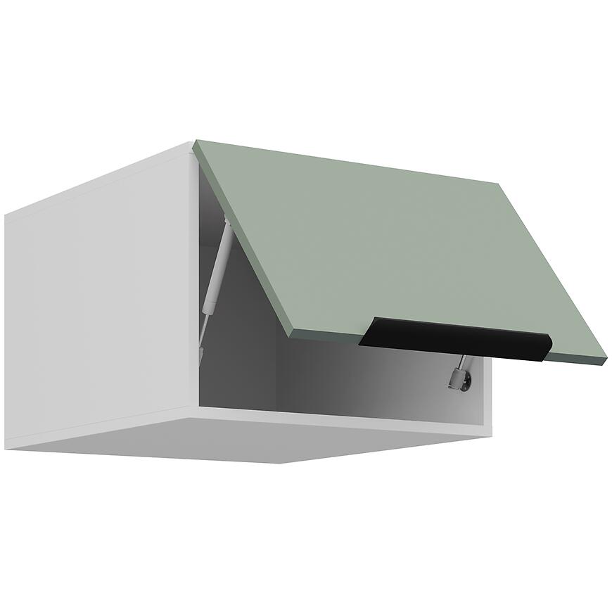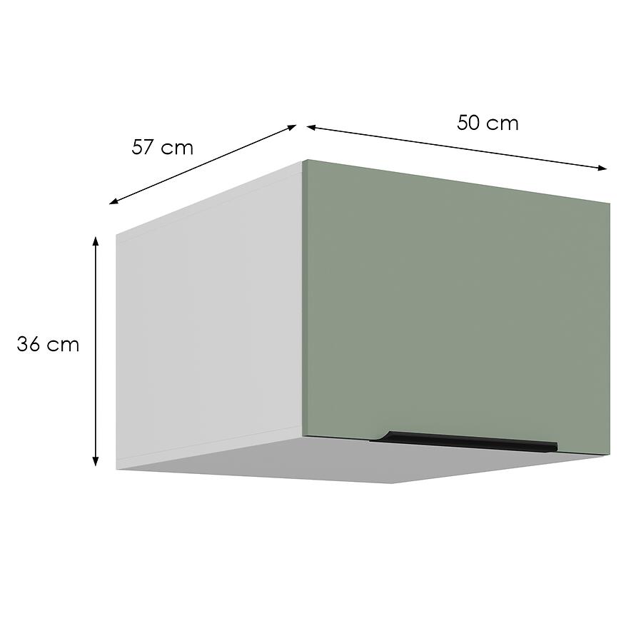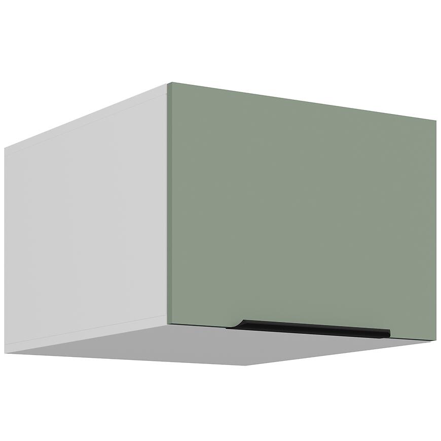 Fronty i korpus wykonano z płyty wiórowej laminowanej, co zapewnia odporność na codzienne użytkowanie. Matowe wykończenie i zielone fronty górne podkreślają elegancję szafki, a system cichego domyku zwiększa wygodę i chroni mebel przed uszkodzeniami.