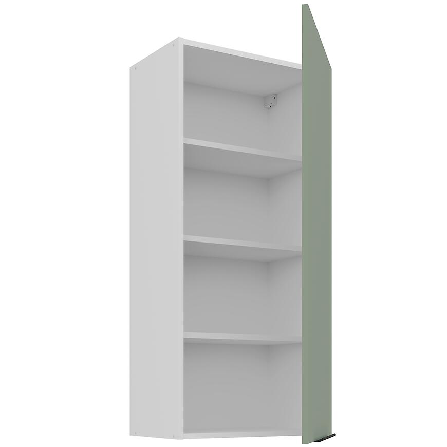 Fronty i korpus wykonano z płyty wiórowej laminowanej, co gwarantuje trwałość i odporność na codzienne użytkowanie. Zielone fronty górne wprowadzają subtelny akcent kolorystyczny, a cichy domyk chroni szafkę przed hałasem i uszkodzeniami.