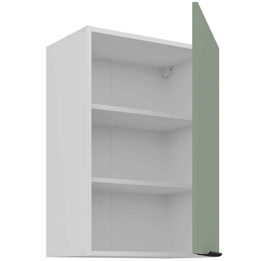 Fronty i korpus wykonano z płyty wiórowej laminowanej, co gwarantuje odporność na codzienne użytkowanie. Zielone fronty górne dodają subtelnego akcentu kolorystycznego, a cichy domyk zwiększa wygodę użytkowania i chroni mebel przed uszkodzeniami.