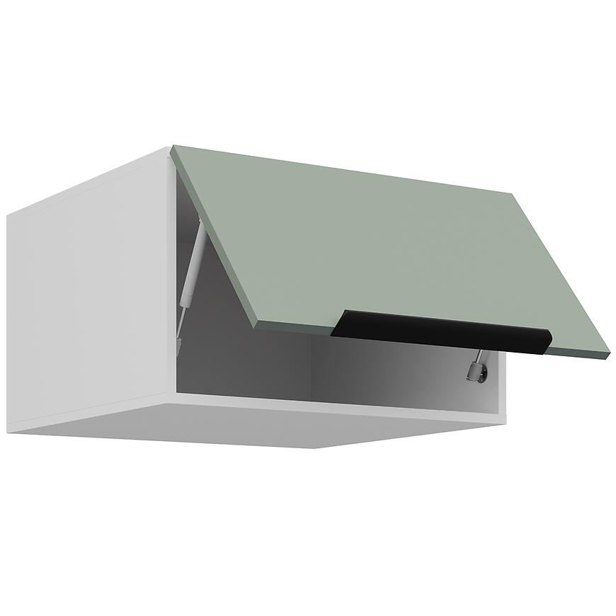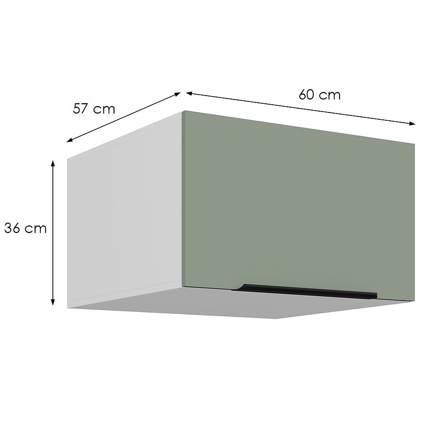 Szafka kuchenna Aria-Sa/Wh Anti Fingerprint 60 Nagu-36 1f to elegancka i funkcjonalna szafka górna, która łączy matowe fronty z białym korpusem i zielonymi akcentami górnymi. Powłoka Anti Fingerprint, solidna konstrukcja oraz system cichego domyku zapewniają wygodę użytkowania, a większa głębokość 57 cm umożliwia przechowywanie większych przedmiotów w kuchni.