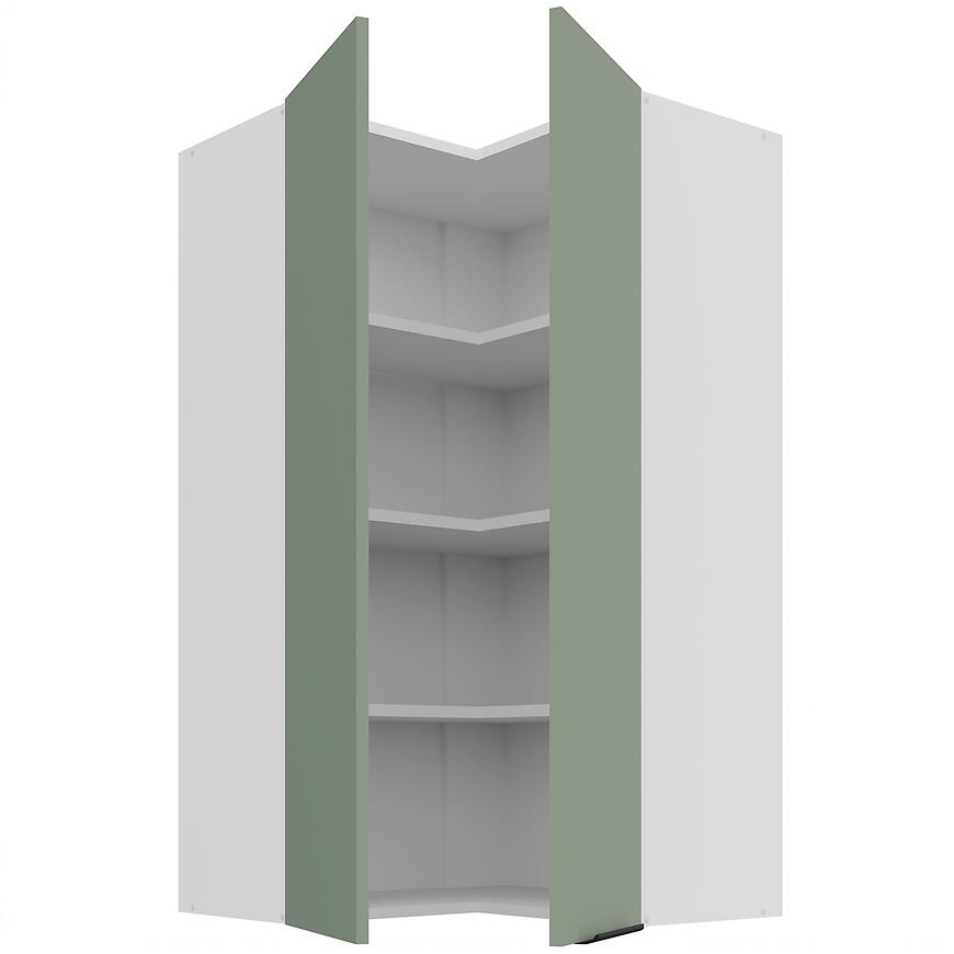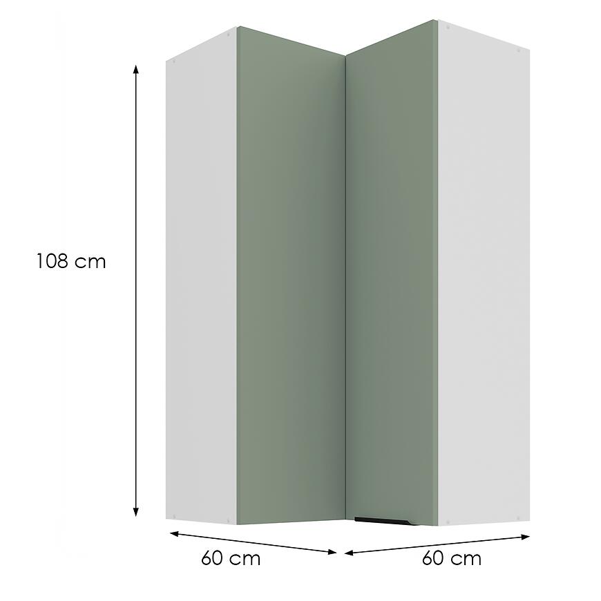 Korpus i fronty wykonano z płyty wiórowej laminowanej, co gwarantuje odporność na codzienne użytkowanie. Matowe wykończenie frontów i korpusu podkreśla elegancki charakter mebla, a zielone fronty górne wprowadzają subtelny kontrast.