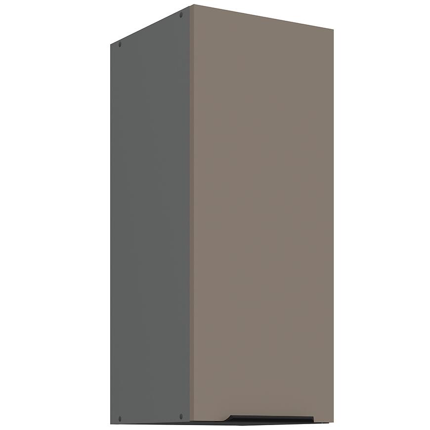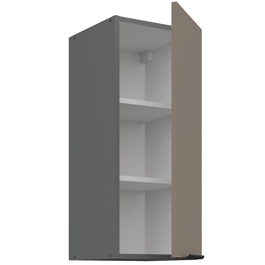 Korpus w kolorze antracytu, wykończony matowo, harmonijnie współgra z frontami, tworząc spójną i atrakcyjną wizualnie całość. Zarówno korpus, jak i fronty wykonane są z płyty wiórowej laminowanej, co zapewnia wytrzymałość, stabilność oraz odporność na codzienne obciążenia. Całkowita waga 11 kg świadczy o solidnej konstrukcji przy zachowaniu lekkości niezbędnej w górnych szafkach.