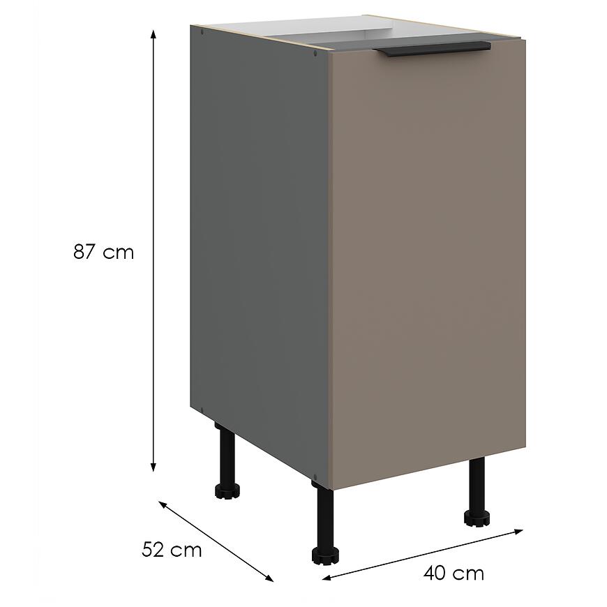 Model Aria-Ta/Ant Anti Fingerprint został zaprojektowany z myślą o codziennym komforcie użytkowania. System cichego domyku w zestawie eliminuje hałas przy zamykaniu drzwiczek, zwiększając wygodę oraz trwałość całej konstrukcji. Szafka należy do kategorii szafek kuchennych dolnych, dzięki czemu idealnie sprawdzi się jako element zabudowy w kuchniach o różnym układzie. Warto pamiętać, że blat nie znajduje się w zestawie, co daje możliwość samodzielnego doboru jego koloru i stylu. Dodatkowo cokół w kolorze korpusu można dokupić osobno, co pozwala dopasować całość do indywidualnych potrzeb aranżacyjnych.
