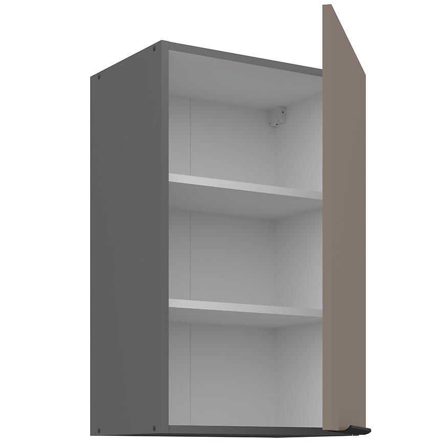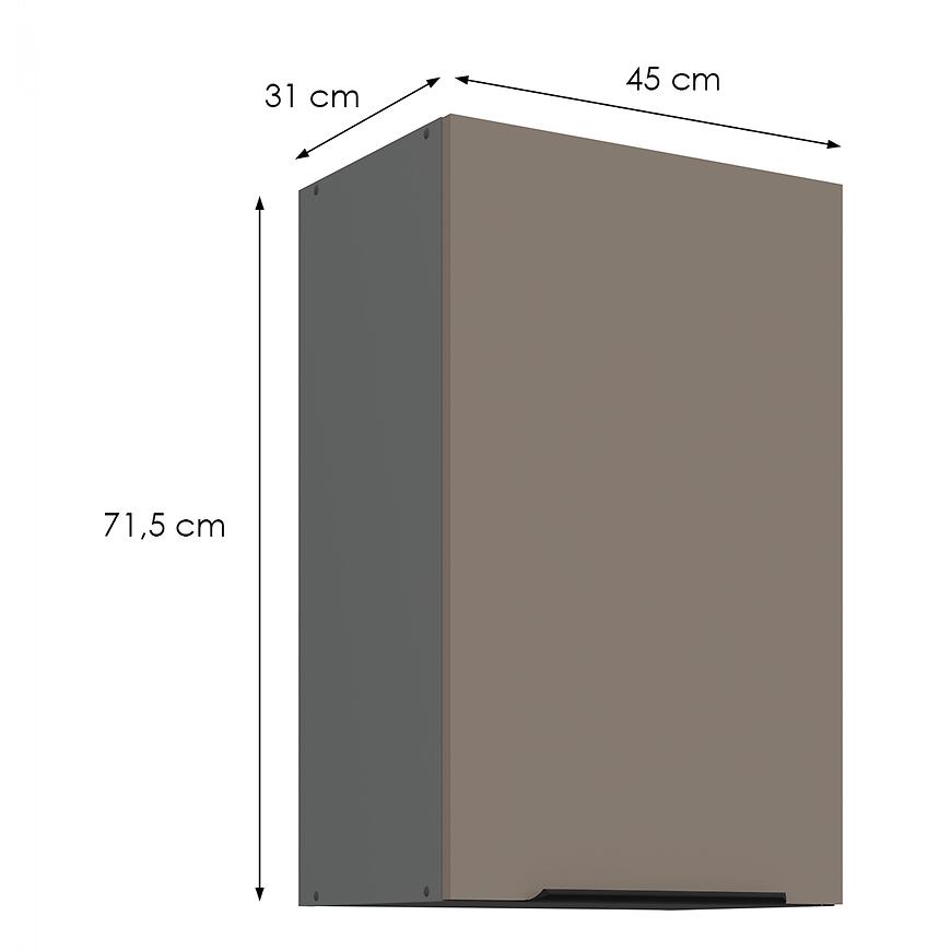 Szafka Aria 45g-72 1F łączy kompaktowe wymiary z eleganckim, nowoczesnym designem. Matowe fronty Anti Fingerprint, praktyczne wymiary, neutralna kolorystyka sandgrau oraz mechanizm cichego domyku sprawiają, że jest funkcjonalnym i trwałym elementem górnej zabudowy każdej kuchni.