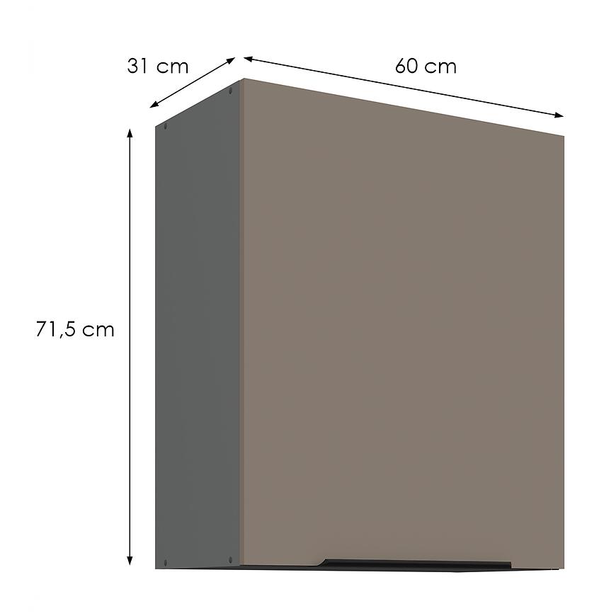 Model Aria 60g-72 1F ma wysokość 71,5 cm, szerokość 60 cm i głębokość 31 cm, co czyni go wyjątkowo praktycznym elementem górnej zabudowy kuchennej. To świetny wybór dla osób, które potrzebują dodatkowej przestrzeni do przechowywania, ale jednocześnie stawiają na estetykę i spójność aranżacji.