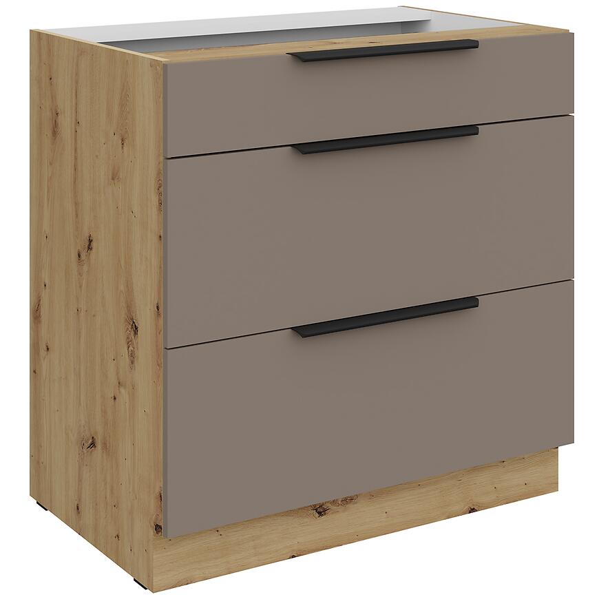 Szafka Kuchenna Aria-Ta/Ar Anti Fingerprint to doskonałe rozwiązanie do nowoczesnej kuchni, łączące elegancki design z funkcjonalnością. Fronty w kolorze sandgrau harmonijnie komponują się z jasnym, drewnopodobnym korpusem w odcieniu dąb artisan, nadając wnętrzu przytulny i nowoczesny charakter. Dzięki matowemu wykończeniu frontów szafka prezentuje się stylowo i jednocześnie jest odporna na odciski palców, co ułatwia utrzymanie czystości.