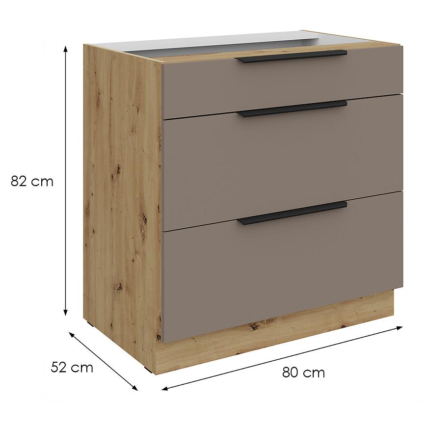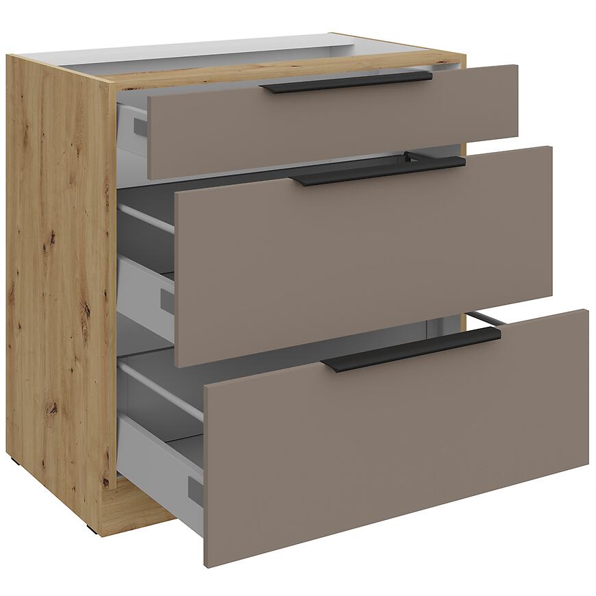 Choć szafka nie zawiera blatu ani nóg, jej stabilna konstrukcja i wysoka jakość wykonania pozwalają na łatwe dopasowanie do indywidualnych potrzeb kuchennych. Jasne, drewnopodobne wybarwienie korpusu nadaje wnętrzu ciepła i harmonii, a matowe fronty w kolorze sandgrau tworzą spójną całość, która podkreśla nowoczesny charakter kuchni.