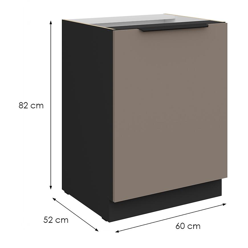 Czarny korpus idealnie współgra z beżowymi frontami dolnymi, tworząc subtelne, ale wyraziste połączenie kolorystyczne. Dodatkowo cokół w kolorze korpusu pozwala uzyskać spójną i elegancką linię zabudowy, co ma szczególne znaczenie w aranżacjach minimalistycznych i nowoczesnych.