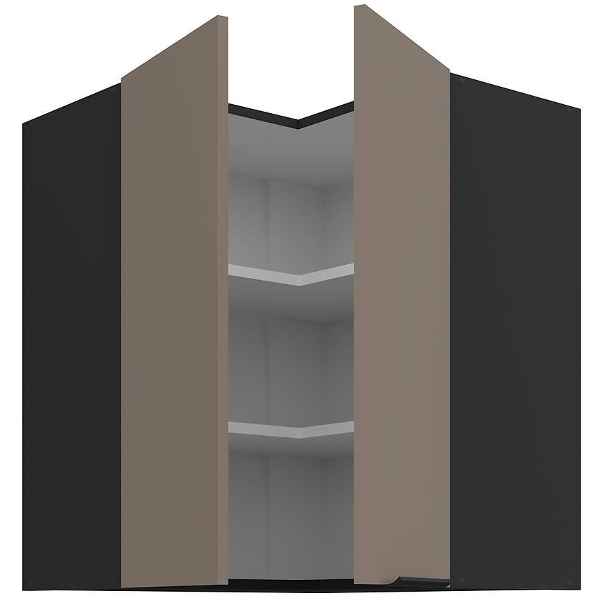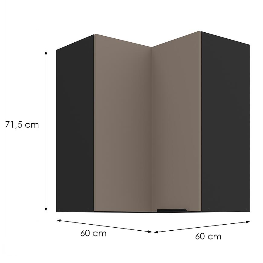 Szafka posiada dwie drzwi (2F) o kącie 90°, co pozwala na wygodny dostęp do zawartości oraz optymalne zagospodarowanie narożnej przestrzeni kuchni. Wymiary szafki to wysokość 71,5 cm, szerokość 60 cm oraz głębokość 60 cm, zapewniając przestronne wnętrze do przechowywania naczyń, garnków, przyborów kuchennych lub drobnych akcesoriów.