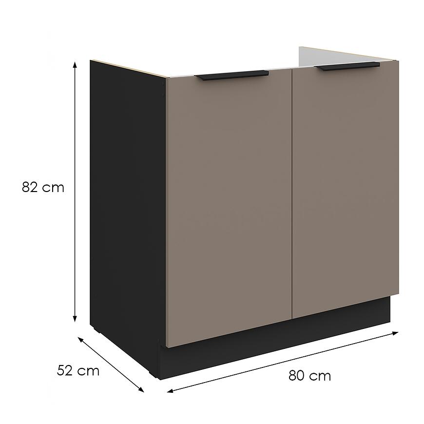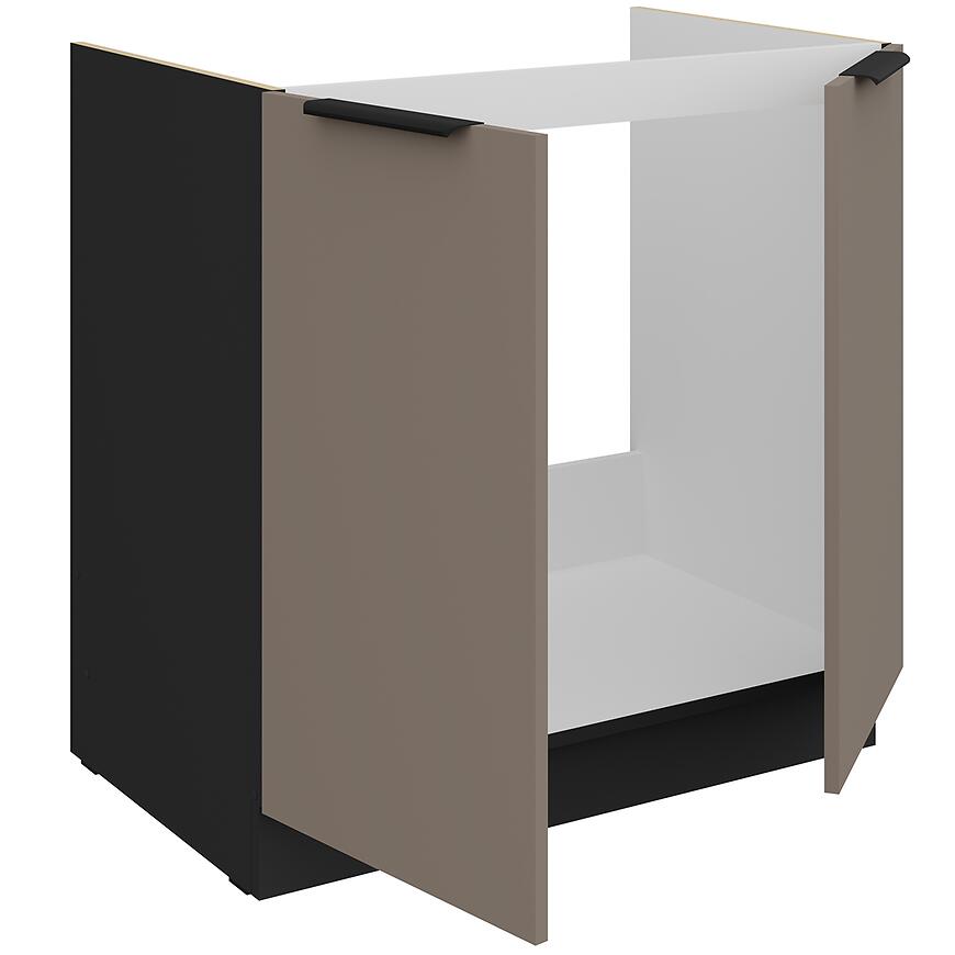 Czarny korpus idealnie współgra z beżowymi frontami dolnymi, tworząc subtelne, ale wyraziste połączenie kolorystyczne. Dodatkowo cokół w kolorze korpusu pozwala uzyskać spójną i elegancką linię zabudowy, co ma szczególne znaczenie w aranżacjach minimalistycznych i nowoczesnych.