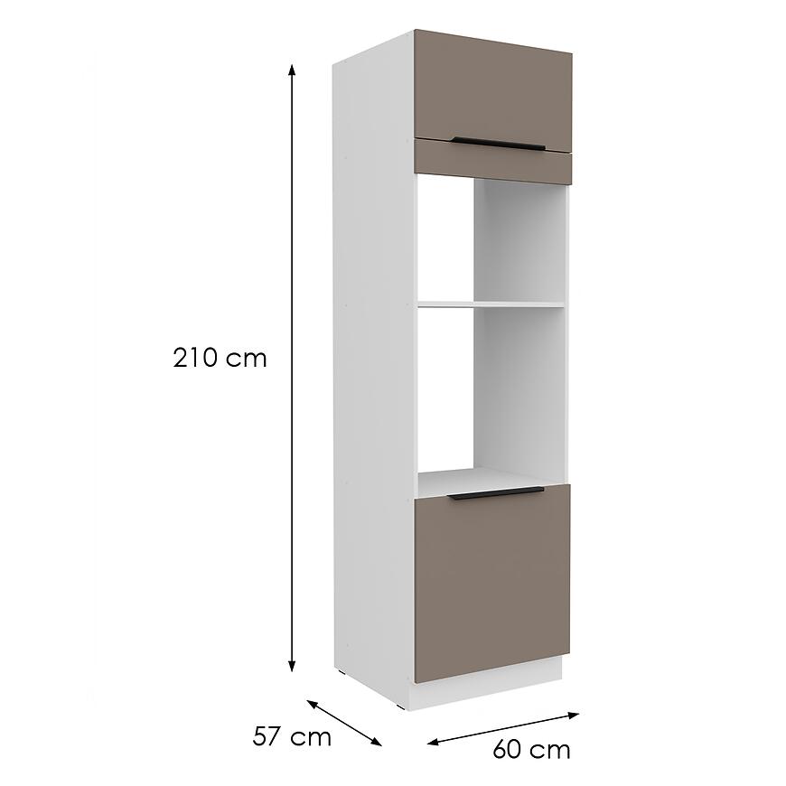 Szafka Kuchenna Aria-Ta/Wh Anti Fingerprint 60dpm-210 2f z kolekcji ARIA SANDGRAU to funkcjonalny element zabudowy kolumnowej, łączący elegancki wygląd z praktycznym układem wnętrza. Jej wymiary – wysokość 210 cm, szerokość 60 cm i głębokość 57 cm – pozwalają na wygodne wykorzystanie przestrzeni w kuchni, oferując dużą pojemność do przechowywania. Matowe fronty w kolorze sandgrau zestawione z białym korpusem tworzą jasną i nowoczesną aranżację, która podkreśla elegancki charakter wnętrza.