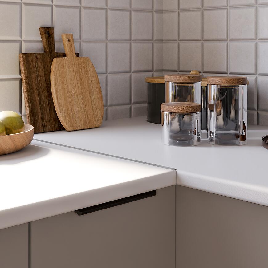 Fronty wykonano z trwałej płyty wiórowej laminowanej, a matowa powierzchnia z powłoką Anti Fingerprint ogranicza widoczność odcisków palców i ułatwia utrzymanie czystości. Dolne fronty w beżowej tonacji harmonizują z białym korpusem, nadając szafce subtelny i stonowany wygląd.