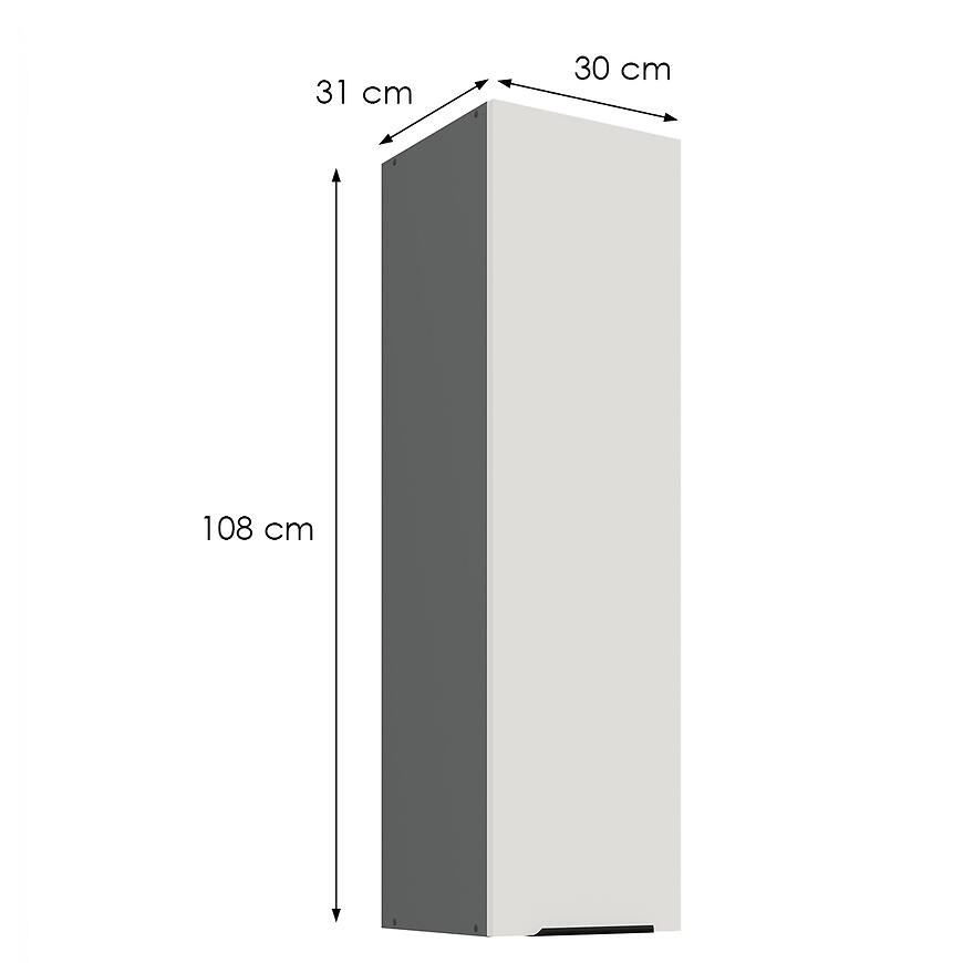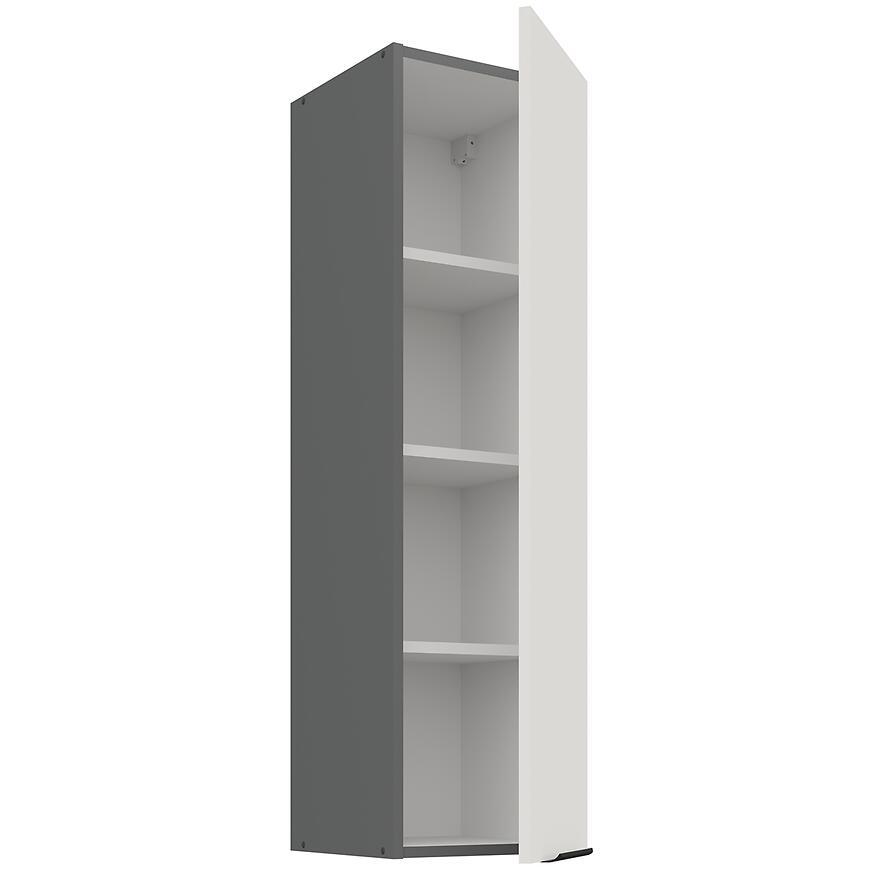 Korpus szafki utrzymano w eleganckiej szarości, dzięki czemu całość tworzy spójne połączenie z białymi frontami. Konstrukcja z solidnej, laminowanej płyty wiórowej zapewnia stabilność oraz wytrzymałość na obciążenia typowe dla szafek kuchennych górnych. Matowe wykończenie korpusu idealnie komponuje się z frontami, tworząc estetyczną, nowoczesną formę, która znakomicie wpisuje się w jasne i ciemniejsze aranżacje wnętrz.