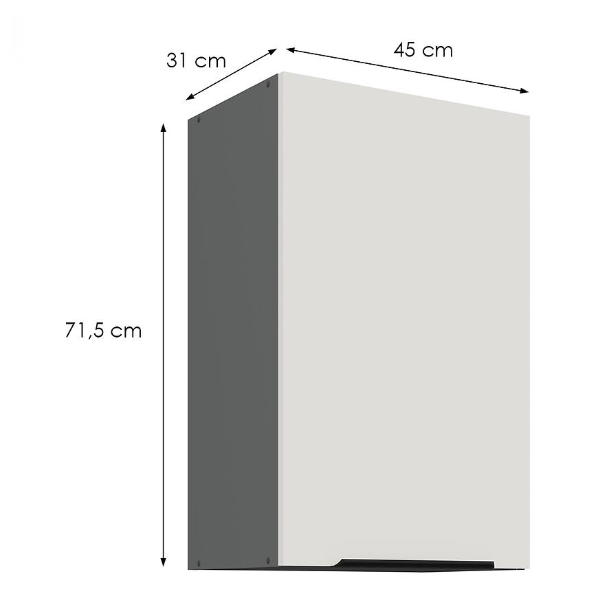 Korpus szafki utrzymano w eleganckiej szarości, dzięki czemu całość tworzy spójne połączenie z białymi frontami. Konstrukcja z solidnej, laminowanej płyty wiórowej zapewnia stabilność oraz wytrzymałość na obciążenia typowe dla szafek kuchennych górnych. Matowe wykończenie korpusu idealnie komponuje się z frontami, tworząc estetyczną, nowoczesną formę, która znakomicie wpisuje się w jasne i ciemniejsze aranżacje wnętrz.